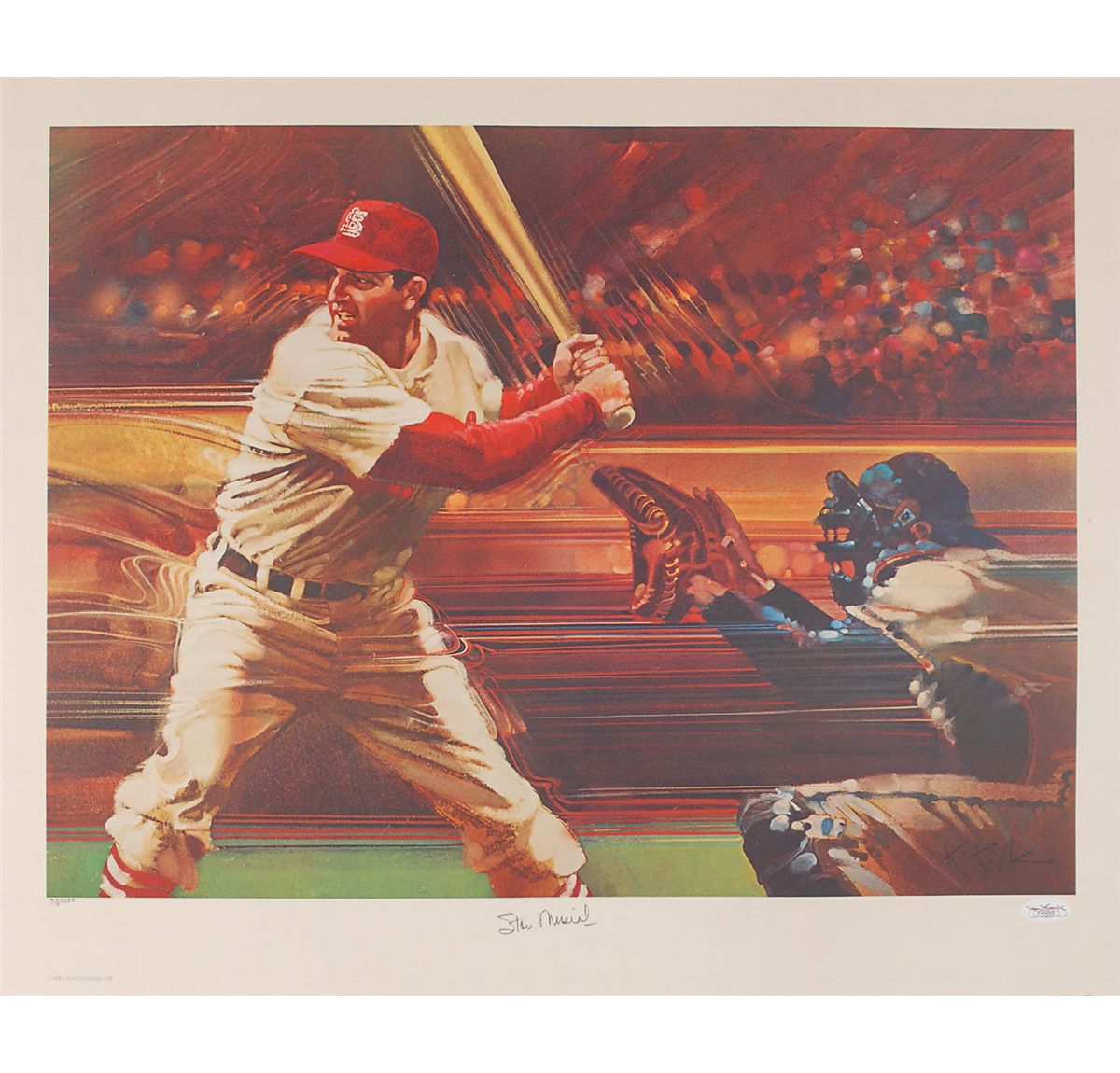 Color limited edition 22 x 18 print of a vibrant depiction of Musial at bat, numbered 713/1000, signed in the lower border in pencil. In fine condition, with light creases and a JSA label affixed to the lower right. Accompanied by a certificate of authenticity from JSA. These difficult-to-find prints were issued in the 1970s by Sports Illustrated.
