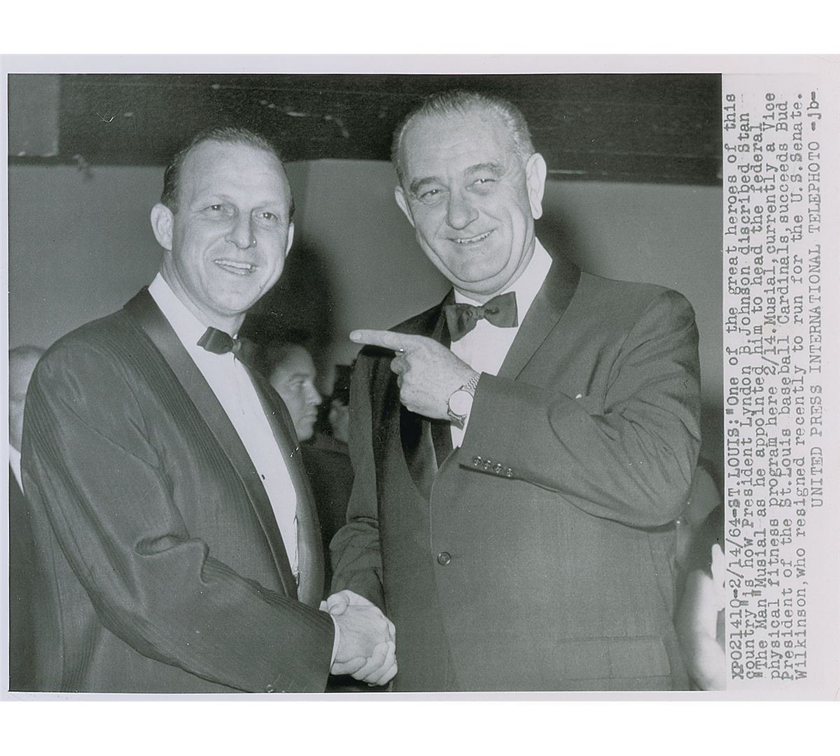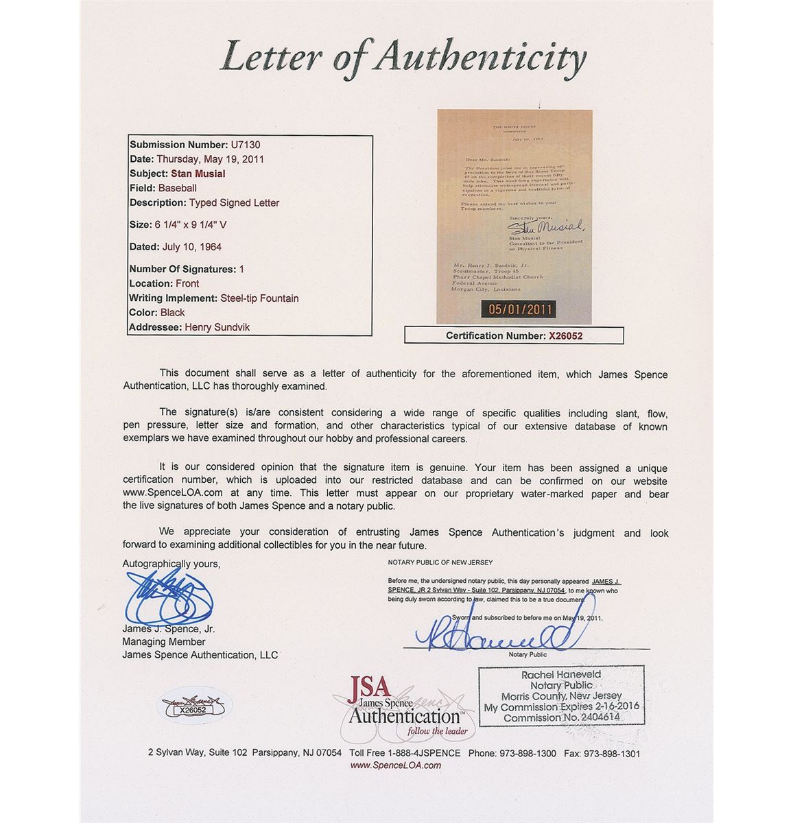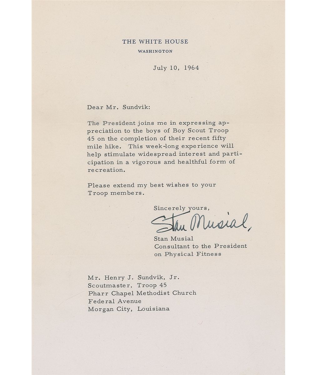 TLS, one page, 6.25 x 9.25, White House letterhead, July 10, 1964. Letter to Scoutmaster Henry J. Sundvik, Jr., written while Musial was serving as the Consultant to the President on Physical Fitness, in part: “The President joins me in expressing appreciation to the boys of Boy Scout Troop 45 on the completion of their recent fifty mile hike. This week-long experience will help stimulate widespread interest and participation in a vigorous and healthful form of recreation.” In fine condition. Accompanied by the original White House mailing envelope, a photo of Musial and President Lyndon B. Johnson, and a full letter of authenticity from JSA.