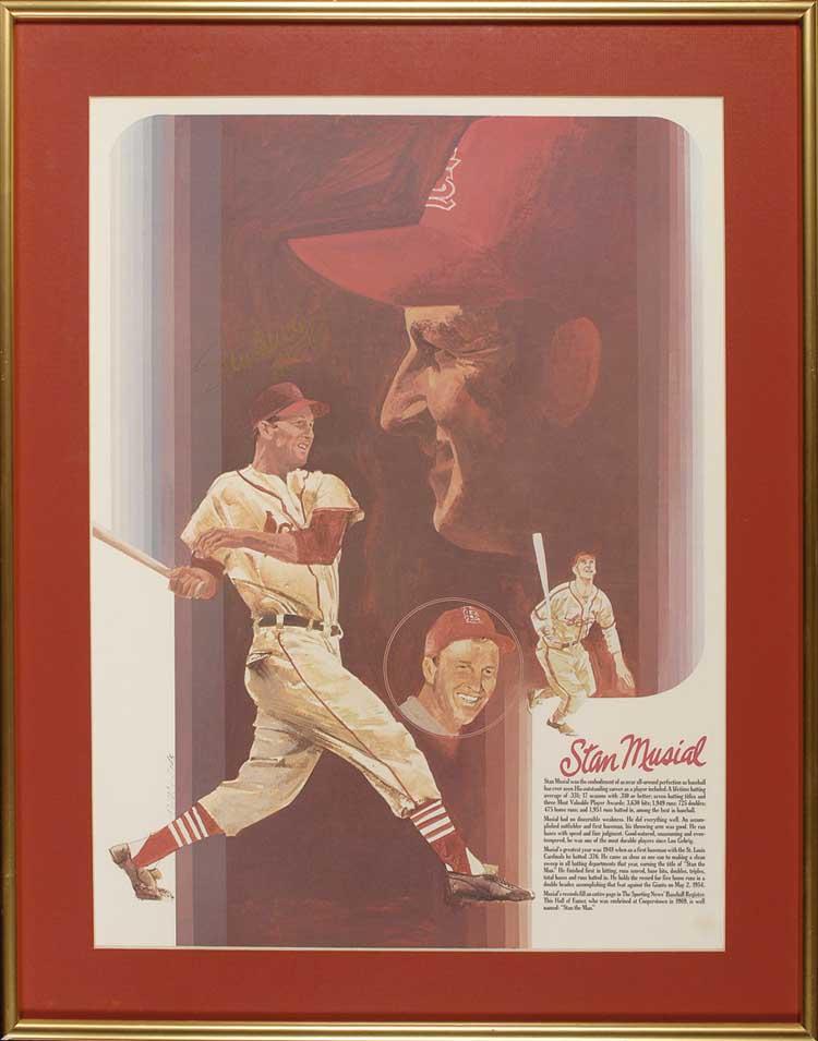 Color 17 x 23 lithograph commemorating his career, signed in gold ink, “Stan Musial, HOF 69.” Matted and framed to an overall size of 23 x 29. Light overall contrast to signature, otherwise fine condition. Oversized. Pre-certified Steve Grad/PSA/DNA and RRAuction COA.