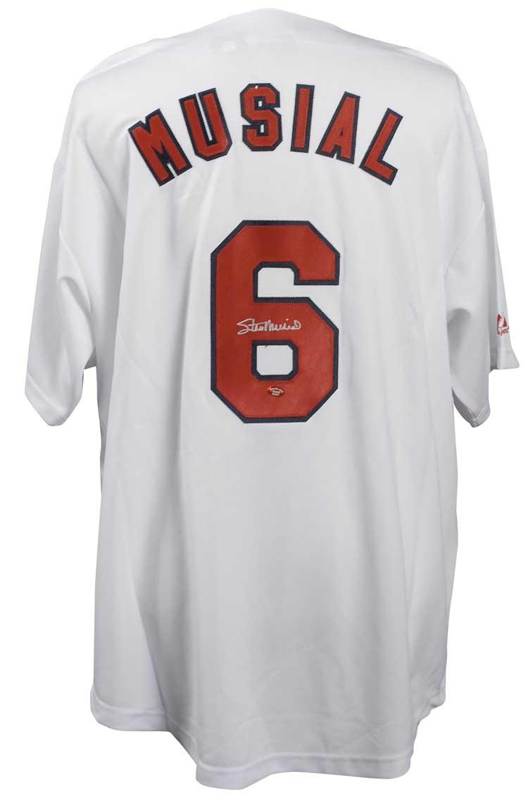 Official Majestic replica St. Louis Cardinals baseball jersey, with sewn on letters and numbers, signed in silver ink on the number on the back. In very fine condition. Pre-certified Steve Grad/PSA/DNA and RRAuction COA.