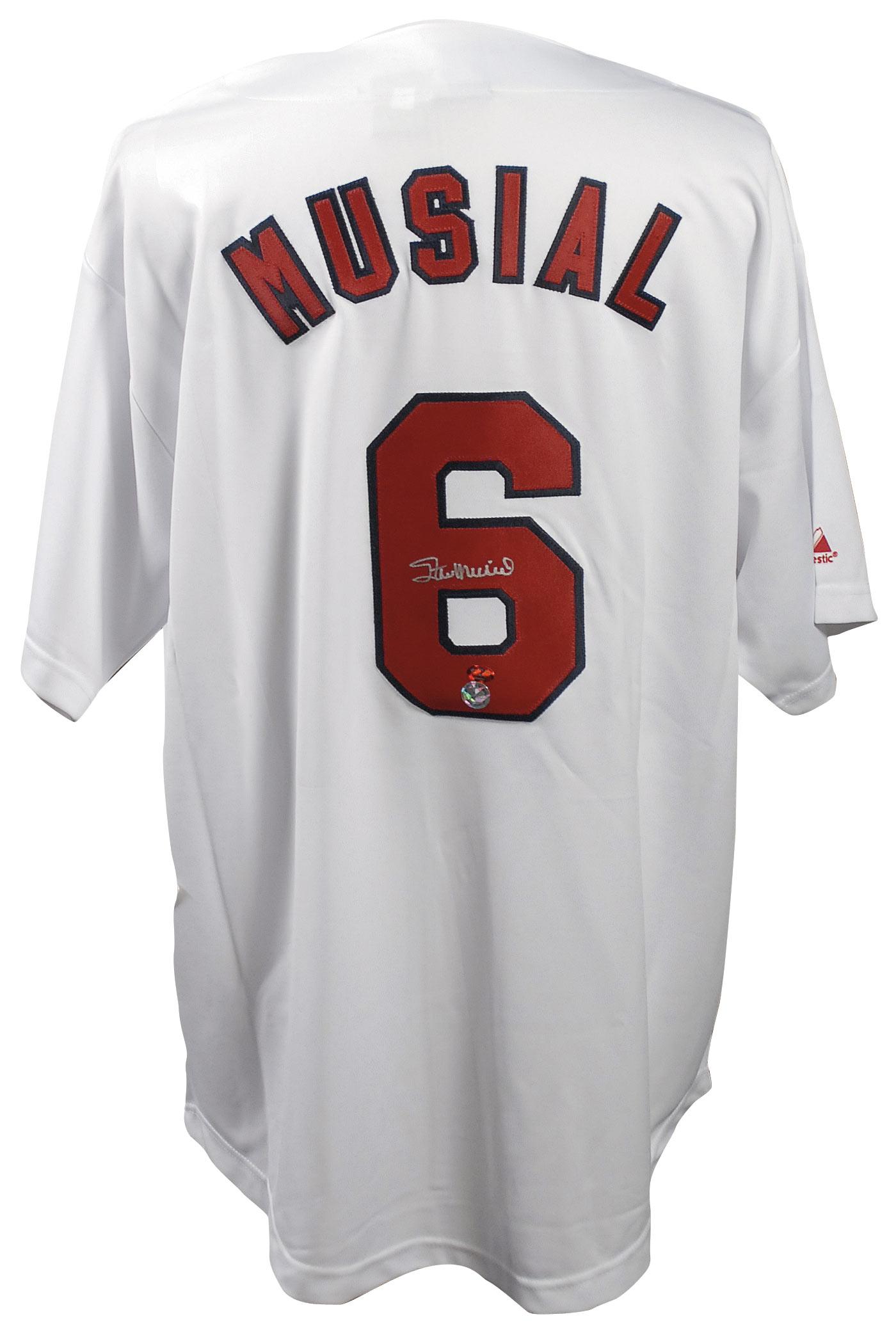 Official Majestic replica St. Louis Cardinals baseball jersey, with sewn on letters and numbers, signed in ink on the number on the back. In very fine condition. Pre-certified Steve Grad/PSA/DNA and RRAuction COA.