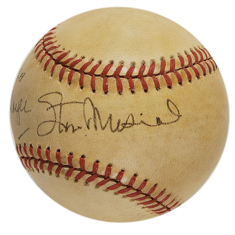 Official Rawlings National League baseball signed and inscribed in black ballpoint, “To Pedro, great player, Stan Musial.” According to our consignor, this ball was signed for Pedro Guerrero. In very good condition, with uniform toning and soiling, likely from batting practice or game use.