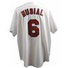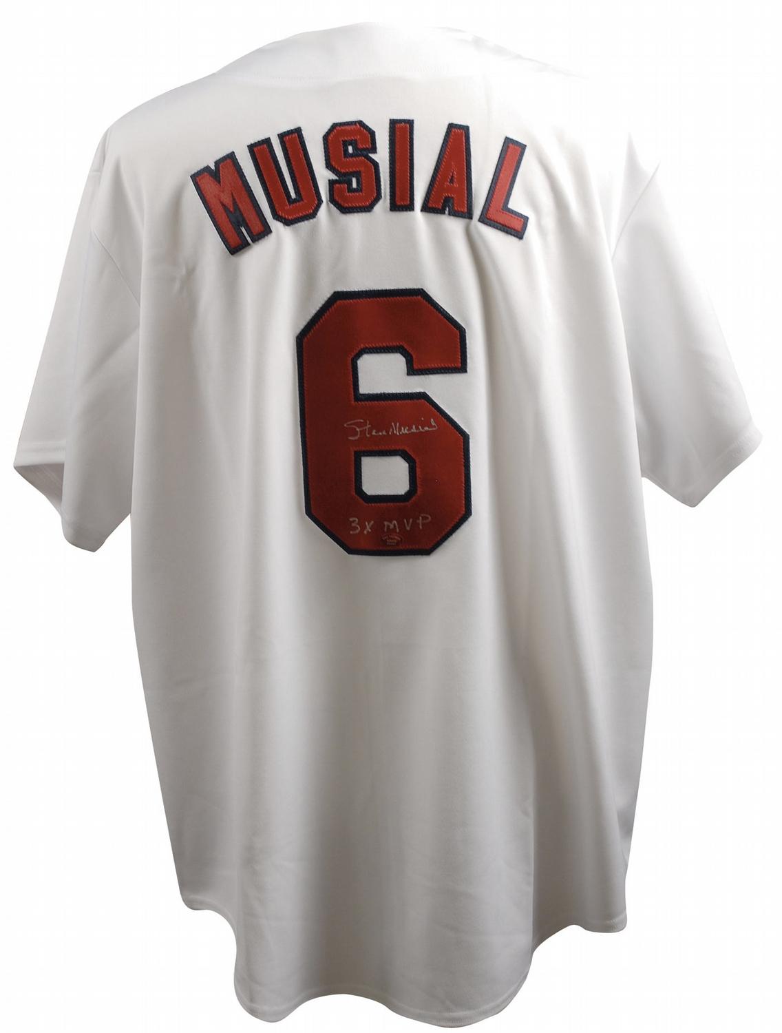 Official Majestic replica St. Louis Cardinals baseball jersey, with sewn on letters and numbers, signed in silver ink on the number on the back “Stan Musial, 3X MVP.” In very fine condition, with a Stan the Man, Inc. authentication label affixed to the number. Accompanied by a certificate of authenticity from Stan the Man, Inc.