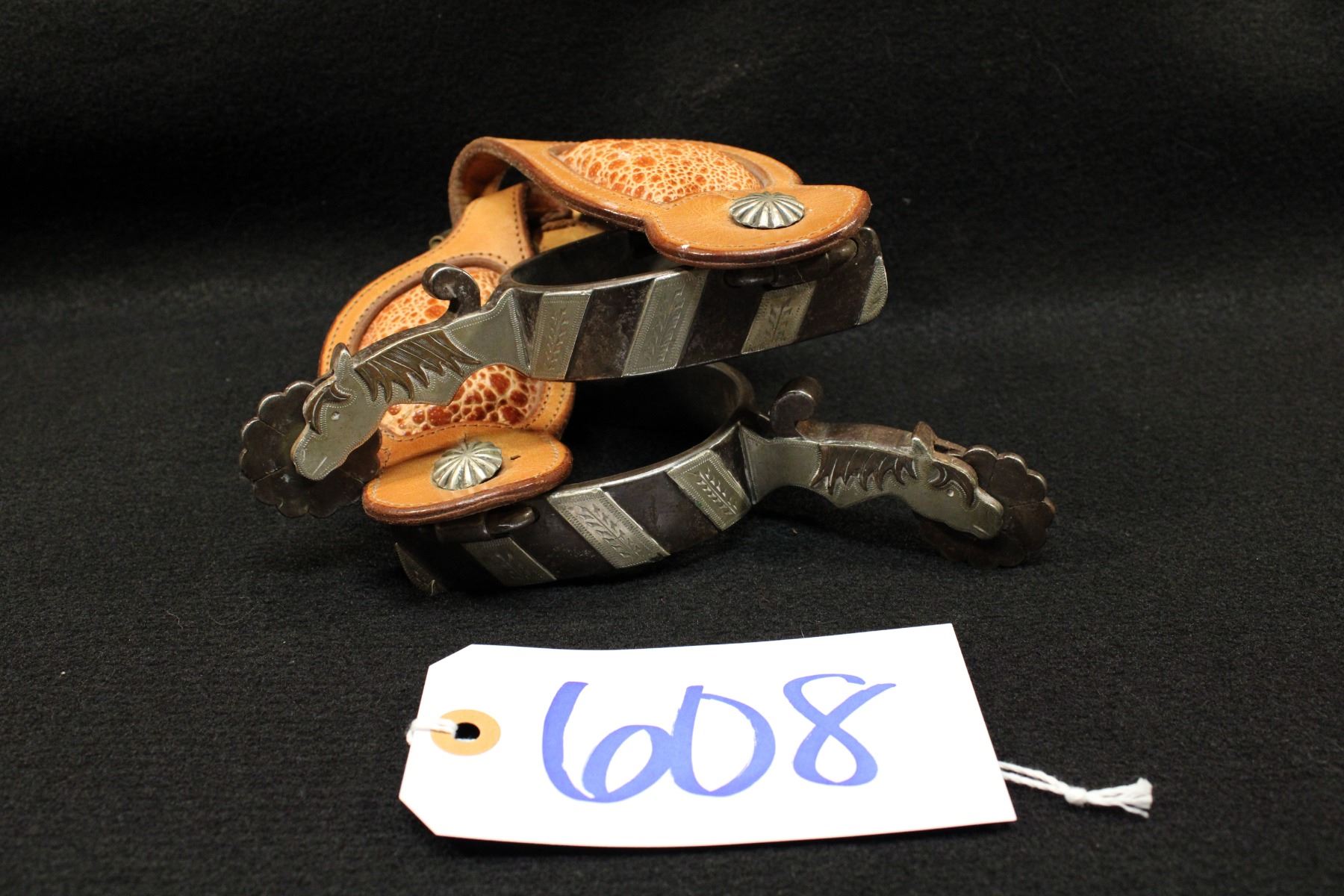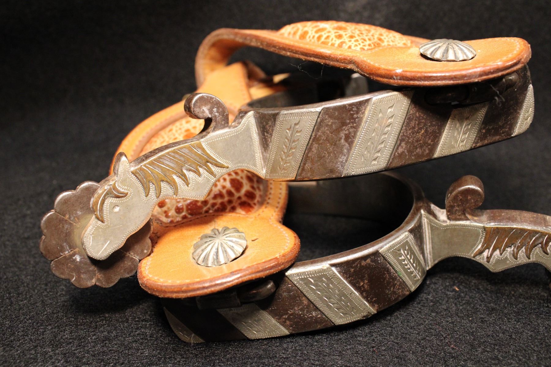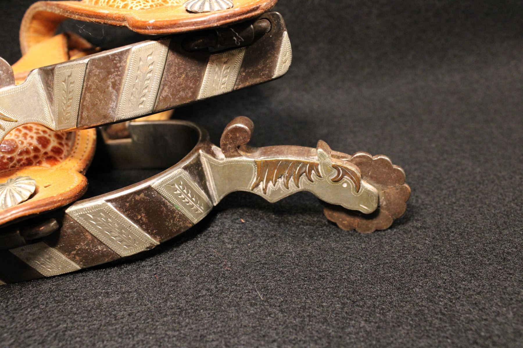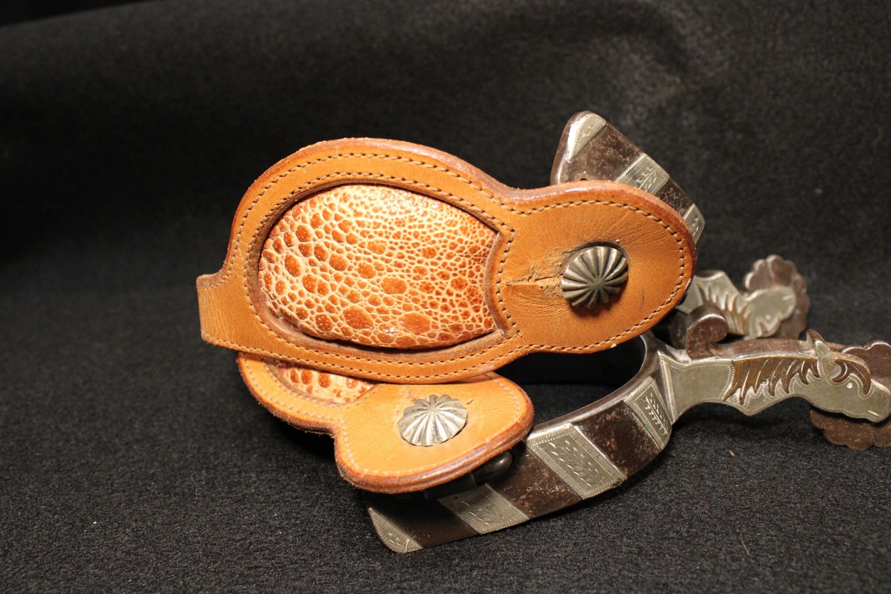 Horshead shanks, leather straps w/ exotic inset, silver and copper overlay