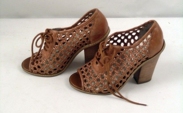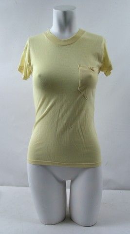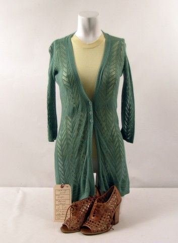 Alex (Addison Timlin) screen worn, hero, green three button with open stitching sweater, burnout yellow vintage t-shirt, and tan leather open toe 'Hinge' heels. (size 6) Includes wardrobe tag!