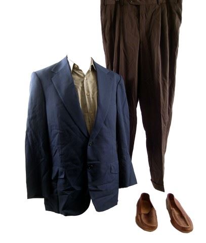 Doc (Christopher Walken) blue two button 'Di Stephano' custom fitted jacket, (Christopher Walken name stitched inside) mint green with brown, tan, and blue fine windowpane short sleeve 'Venice Custom' shirt, brown 'Zinotto' pants, and brown basket weave 'Rockport' shoes. (size 13) Includes wardrobe tag!