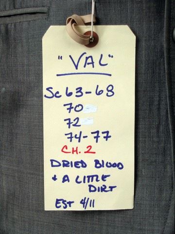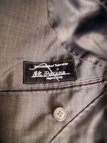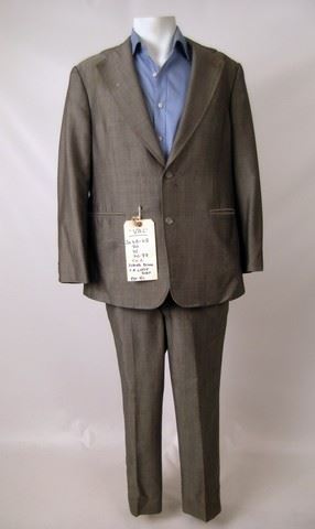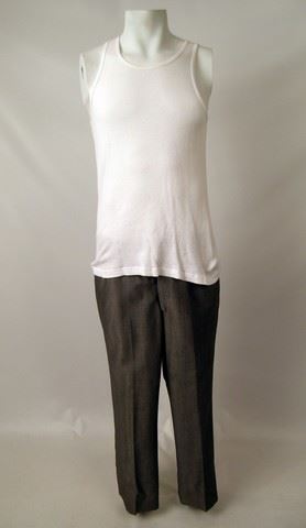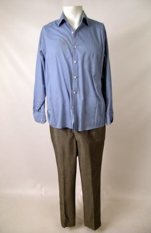 Val (Al Pacino) screen worn, hero, slightly bloody, grey two button custom made 'di Stefano' suit jacket and pants, light blue button front 'Van Heusen' shirt, (size 32/33) and white ribbed 'Calvin Klein' tank. (size L) Includes wardrobe tag!