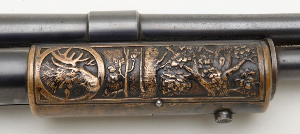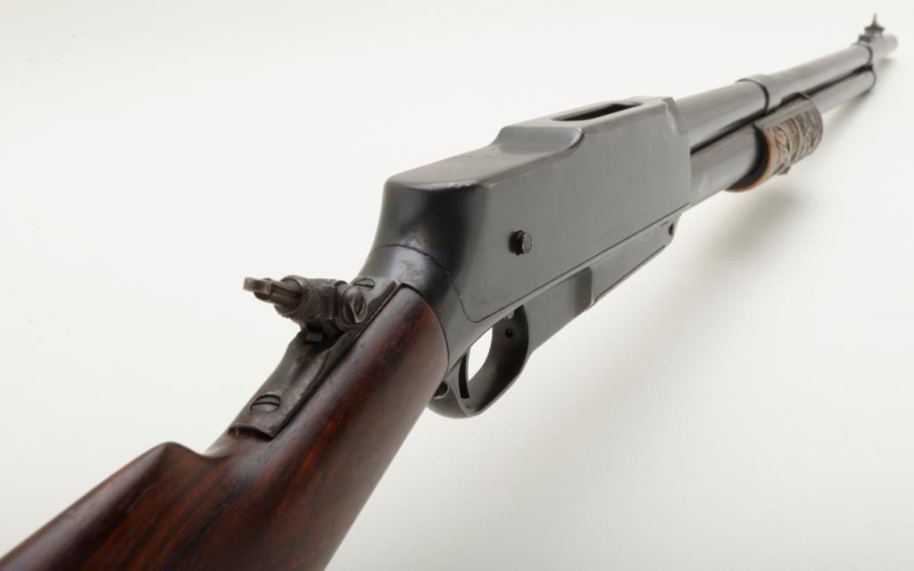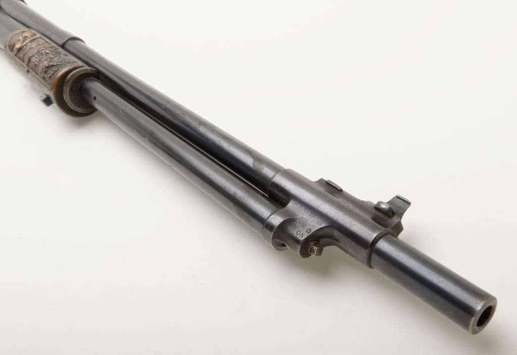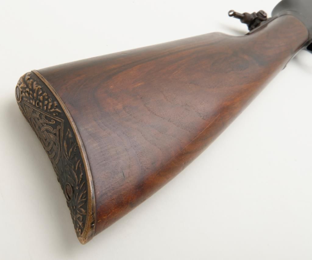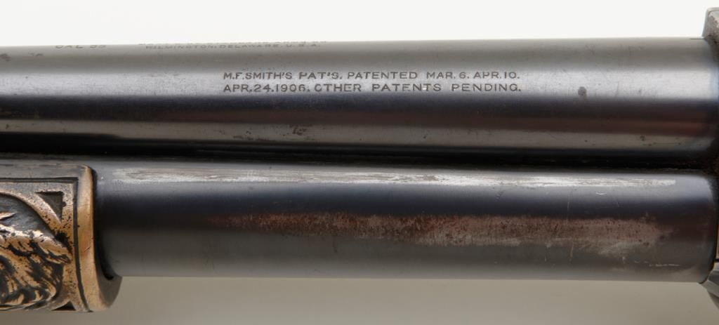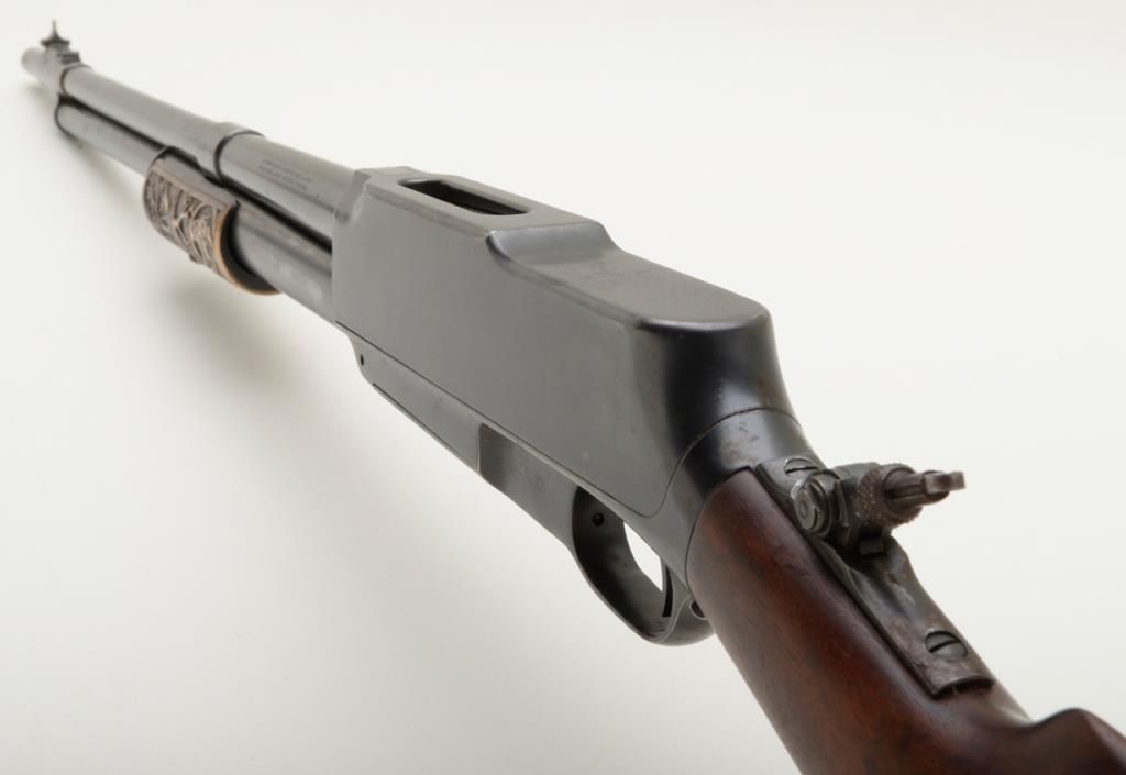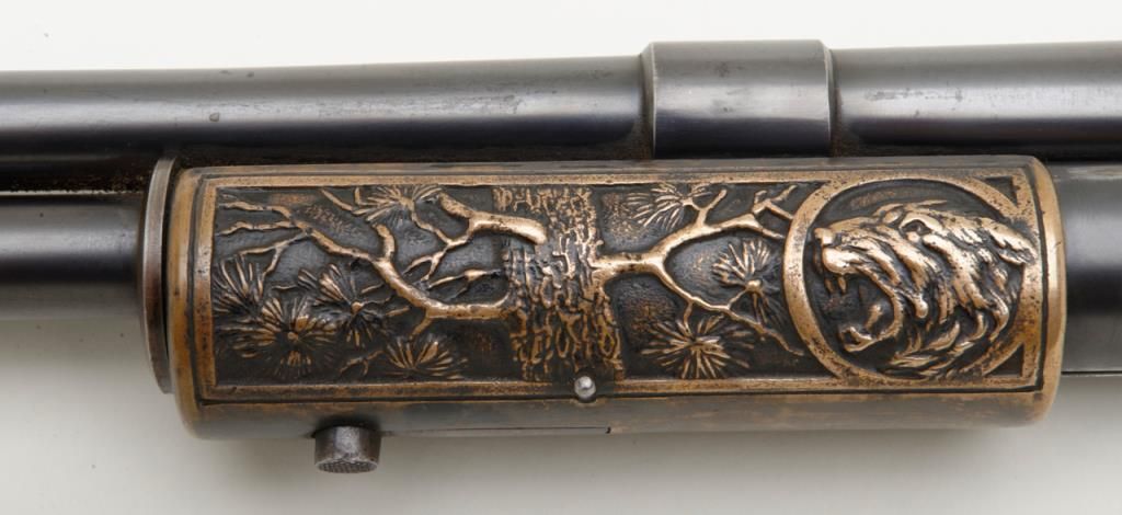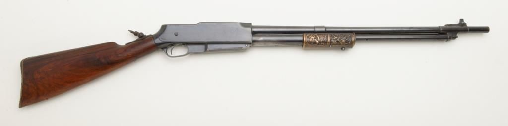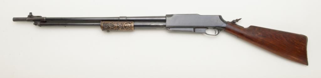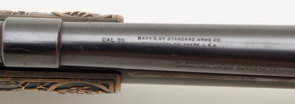 Standard Arms Company pump action and semi-automatic repeating rifle in .35 caliber showing M.N. Smith’s patent, April 24, 1906, serial number 6973. The rifle retains 80% to 90% original blue thinning in operating areas and at the edges with some normal scratches and slight wear. The cast bronze fore end grip is very crisp and shows considerable original darkened finish as does the butt plate. The butt stock has been lightly cleaned and is at least very good. A period folding sight is mounted on the tang. The action is working well and the rifle is crisp. Seldom encountered. Est.: $800-$1600