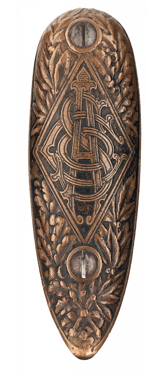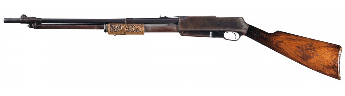 Manufactured in limited quantities circa 1910. Blade and adjustable semi-buckhorn sights. Bronze alloy forearm and buttplate featuring high relief designs with straight grip walnut stock stamped with a non-factory pattern.