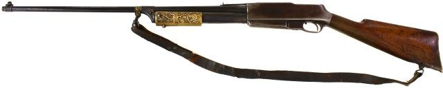 repeating hammerless rifle 24" barrel, blued finish, walnut rear stock, forend in cast brass with moose and wolf design, butt plate also cast in brass with initial COAS. Overall good condition, excellent action and good bore. Modern. Produced in limited quantities C. 1910. Est. 800-1200