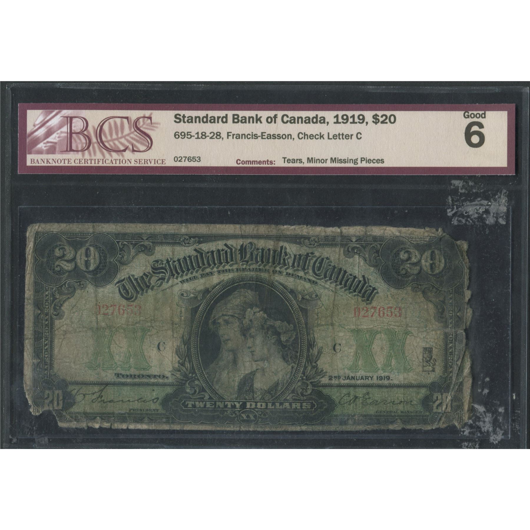 Standard Bank of Canada 1919 $20 banknote. Graded G (good) 6 by BCS. Serial Number: 027653. 695-18-28, Francis-Easson, Check Letter C. Tears, Minor Missing Pieces. This is a very rare note, in affordable condition. Worth a premium bid.