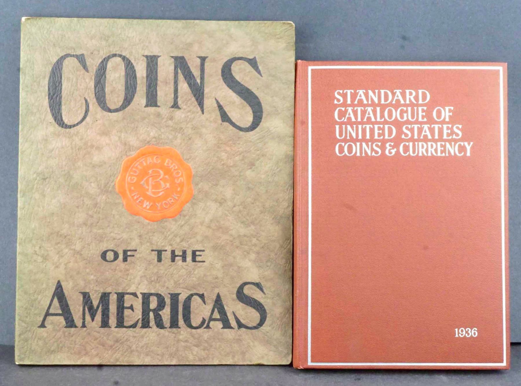 PLUS - COINS of the AMERICAS GUTTAG BROS, New York 1924 1) Very Fine condition, bound in brown cloth stamped in silvery white. 190 pages, plus advertisements. 2) A large format book, 220 x 287 mm (8 x 10 1/18"). In heavy paper covers. Date and small note by Father Marcotte on the title page, otherwise VG.