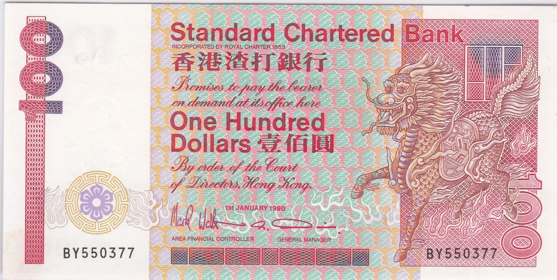1990,渣打銀行, $100, 編號: BY550377, UNC 未使用品相