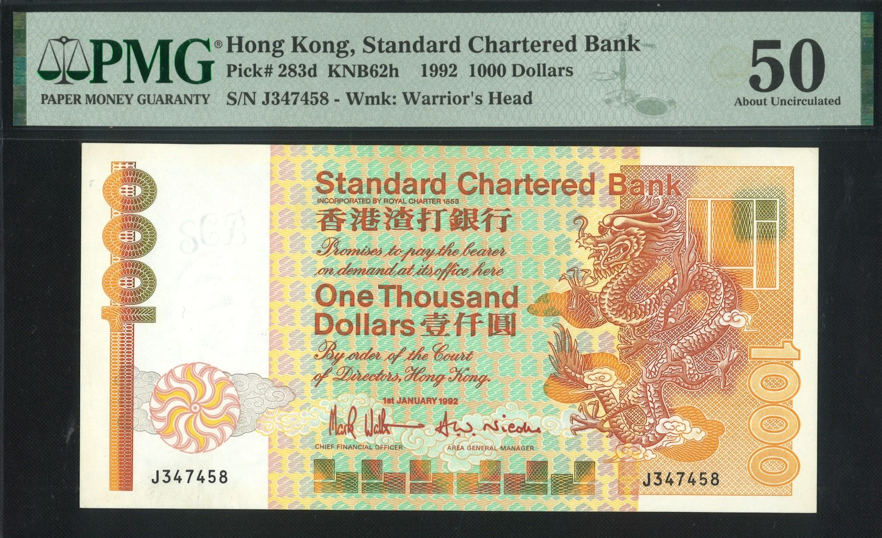 1992, 渣打銀行, $1000, 編號: J347458. PMG 50. 少有尾版J 冠, 只發行五十萬張