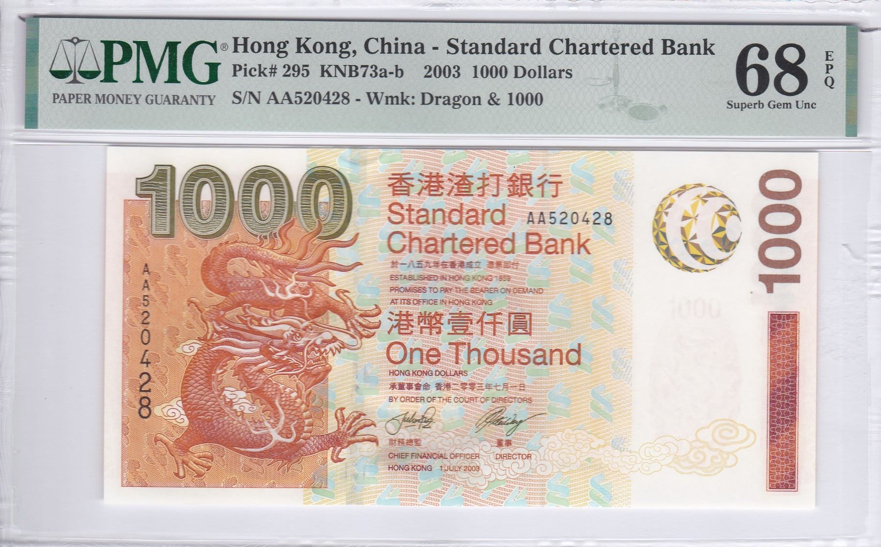 2003,渣打銀行, $1000, AA520428, PMG 68EPQ. 高分AA首發冠