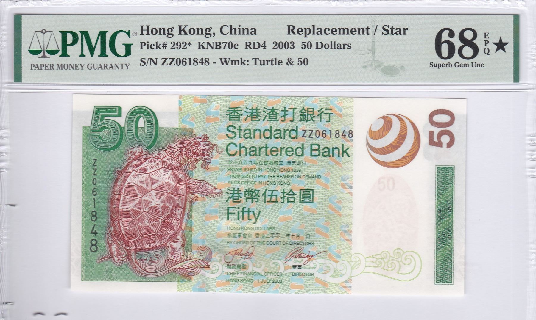 2003,渣打銀行, $50, 編號: ZZ061848, PMG 68EPQ. 星標