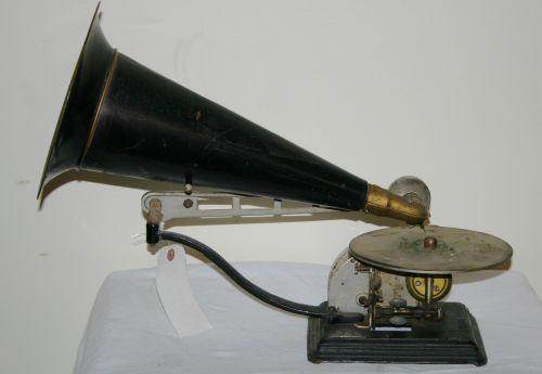 Small open works phonograph with black horn. Standard Disc Type AY phonograph produced by Columbia American Graphophone for Standard Talking Machine Co. Plays disc records with large center hole. Wearing of paint on horn.