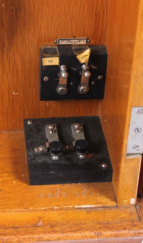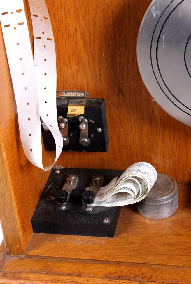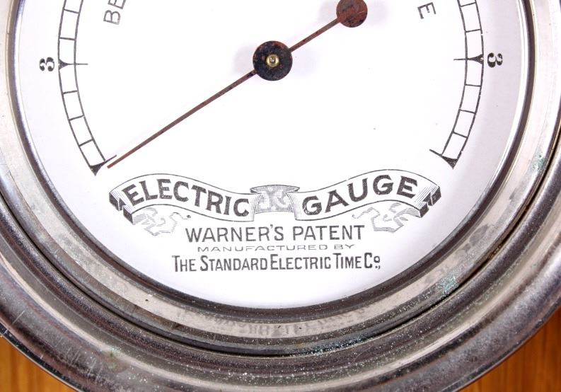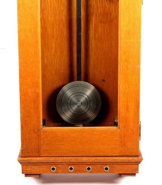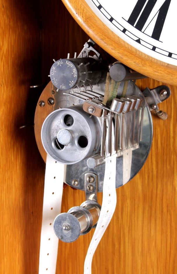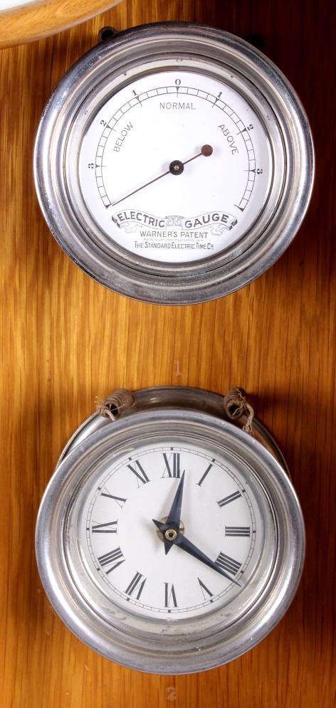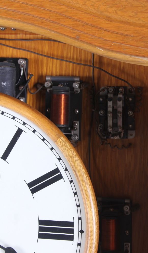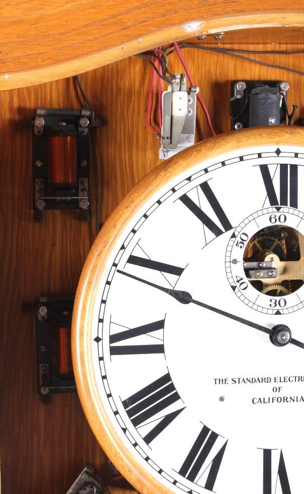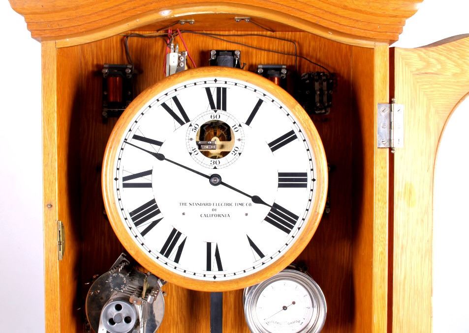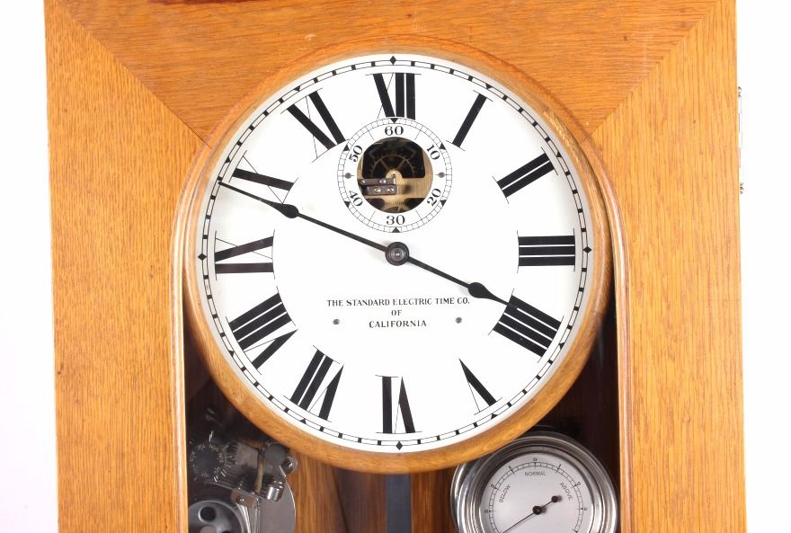 This is a master clock made by the Standard Electric Time Company of California. The clock features a solid quarter sawn oak cabinet. Inside the cabinet is a central clock with a pair of gauges below it. In conjunction with the clock mechanism is a ticker tape. This clock was designed to operate several other clock such as in a school or factory. The master clock is in good overall condition, however, it is not currently in working condition. The clock measures 9" x 22.5" and is 65" tall.