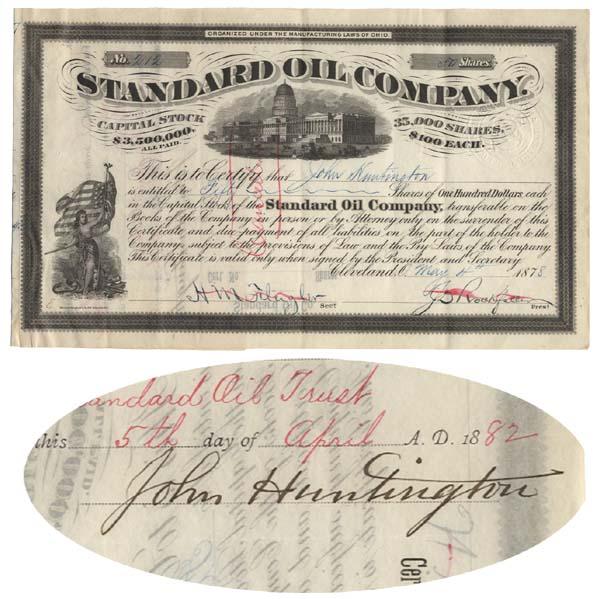 1878, Ohio. Stock certificate of the Standard Oil Company. Signed as president by John D. Rockefeller and as secretary by Henry M. Flagler. Issued to John Huntington for 50 shares and endorsed by him on verso. John Huntington, born in England in 1832, came to Cleveland in 1854. He joined the oil refining firm of Clark and Payne in 1863. When the firm was absorbed by Standard Oil, Huntington received 500 shares of Standard Oil stock. He became one of the wealthiest men in Cleveland and his fortune continued to grow through interests in oil refining, shipping, mining, stone quarrying, and real estate. Huntington's interests in art developed after making a grand tour of Europe with his second wife. He built a summer estate in 1880 on 100 acres of land, now known as Huntington Reservation, part of the Cleveland Metroparks System. The park features the only public beach between Cleveland and Lorain, as well as the Huntington Playhouse, Baycrafters and Lake Erie Nature and Science Center. In the early 20th century, the construction of the electric railway between Cleveland and Toledo made Dover Township a popular summer retreat for wealthy Clevelanders. Among these new residents was John Huntington, a Standard Oil executive. His former property is now the Huntington Reserve of the Cleveland Metroparks. John Huntington died in 1893. His will created the John Huntington Art and Polytechnic Trust to provide for a free public art museum and a free evening polytechnic school. The John Huntington Fund For Education was created from this trust in 1953” This information on Huntington was taken from Cleveland Museum of Art website. Light red pen cancellation through Rockefeller and Flagler’s signature as is typical for this issue. Huntington’s bold signature remains uncancelled.