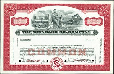 OH. 1930-1940's. Specimen. Odd shs, Common Stock, red. Vignette of allegorical man flanked by refinery on left and old fashioned gasoline truck delivering gas to gas station. The signature of the president is crossed out in pencil, evidently for a change in the stock certificate design. SBNC. XF.