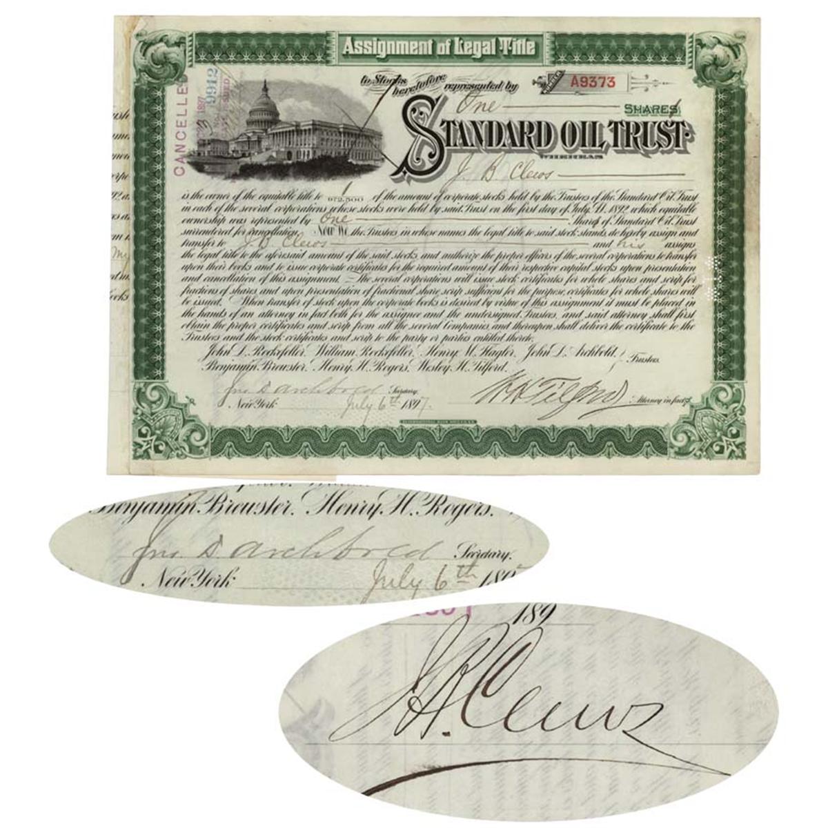 1897, New York. Assignment of Legal Title for “1/972,500 of the amount of corporate stocks held by the Trustees of the Standard Oil Trust in each of the several corporations whose stocks were held by said Trust on the first day of July 1892...” Green/Black. Engraved vignette of the capitol building at upper left. Issued to and signed on verso by J. B. Clews. Signed as Secretary by John D. Archbold and as Attorney in Fact by Wesley H. Tilford. These certificates were utlilized to delay the breakup of the Trust for seven years. An important issue from the Standard Oil Trust. In Extremely fine condition. Fine condition. Pen, stamp and embossed cancellations, all paper intact.