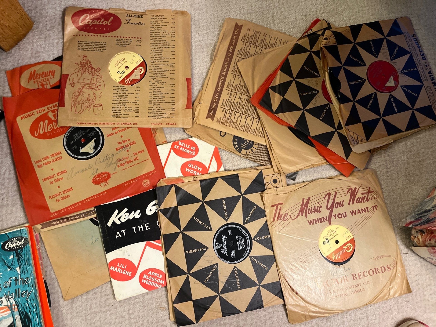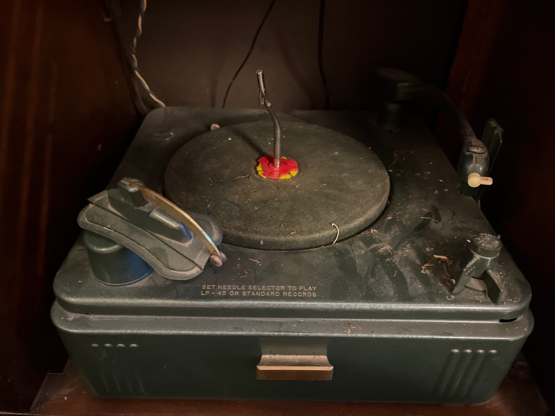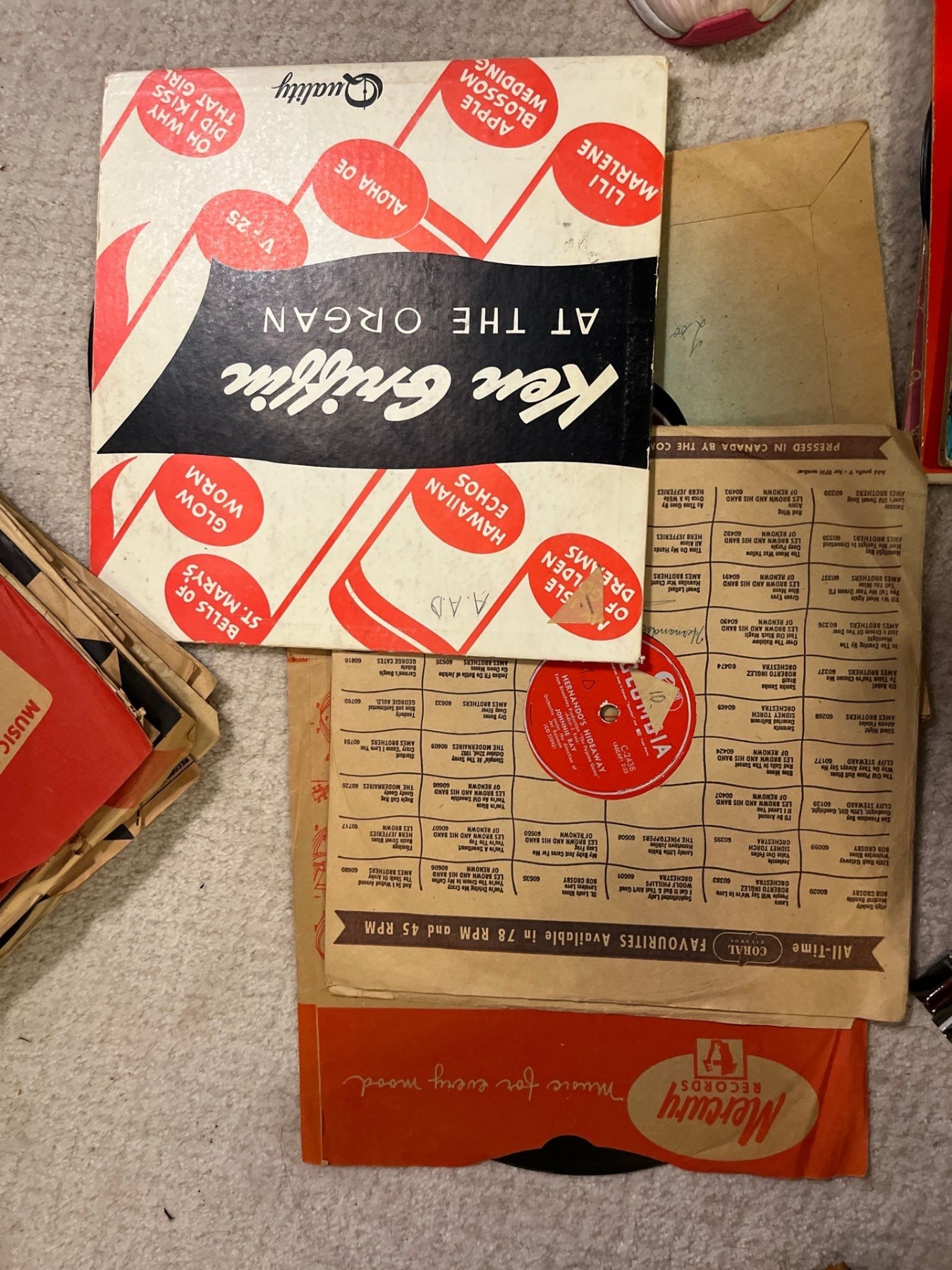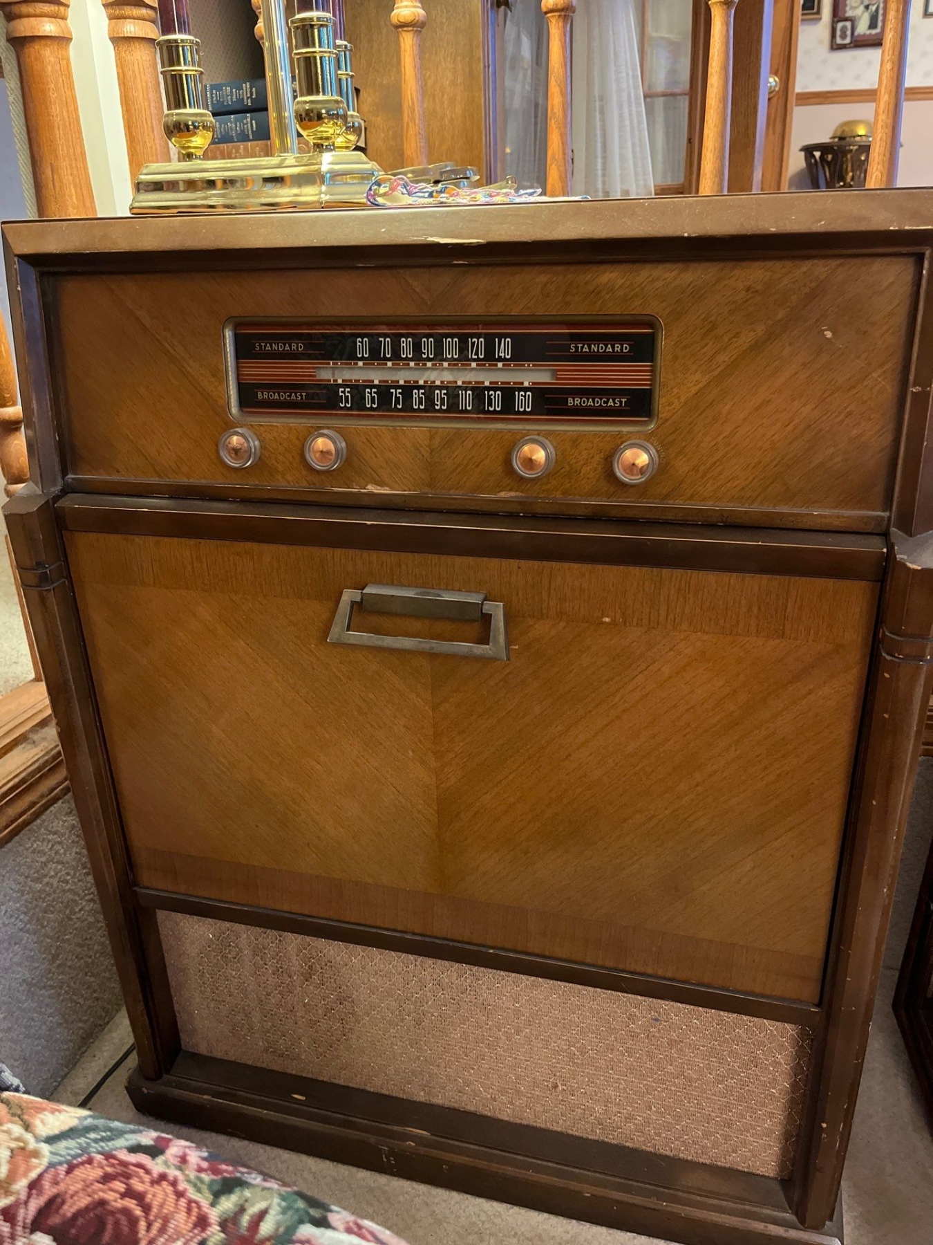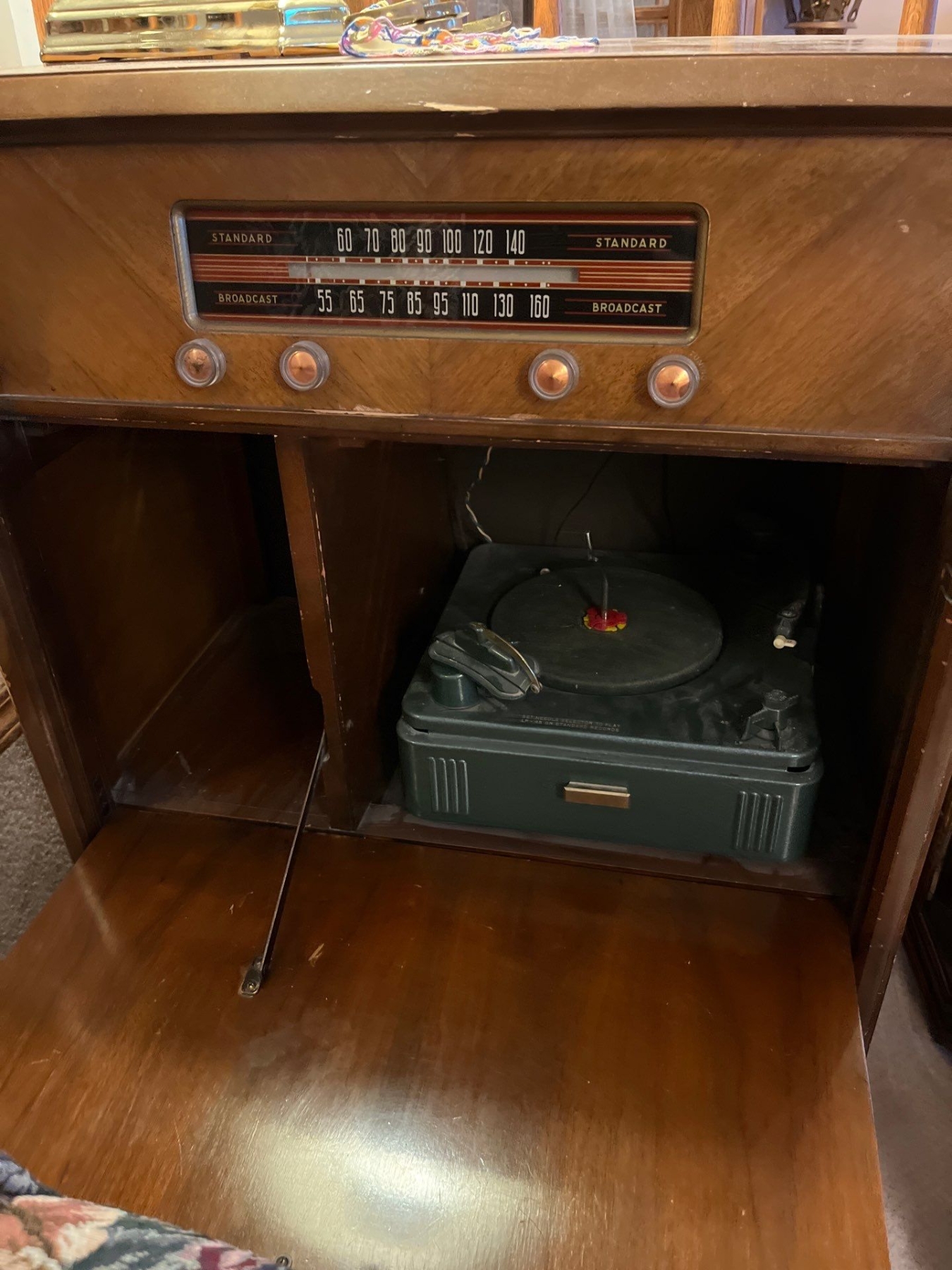 Standard broadcast radio, and record player with a great collection of original 8” records .