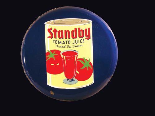 Standby Tomato Juice Porcelain Button Sign. Minor edge ware and ding at 7:00 otherwise excellent condition. 36 inch diameter.