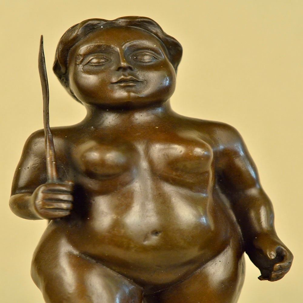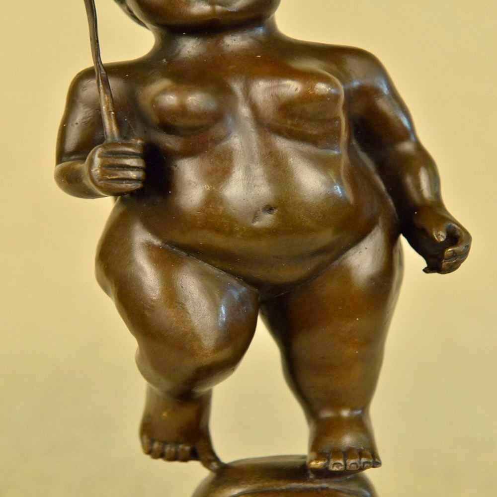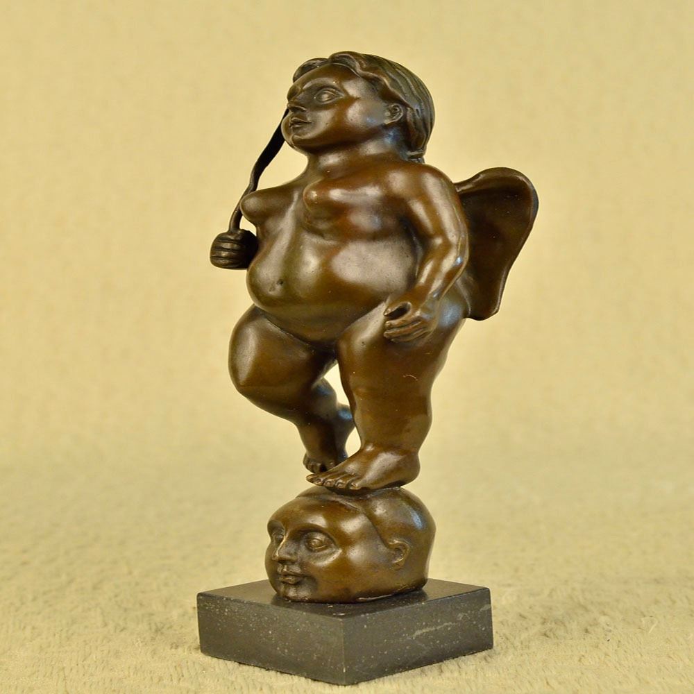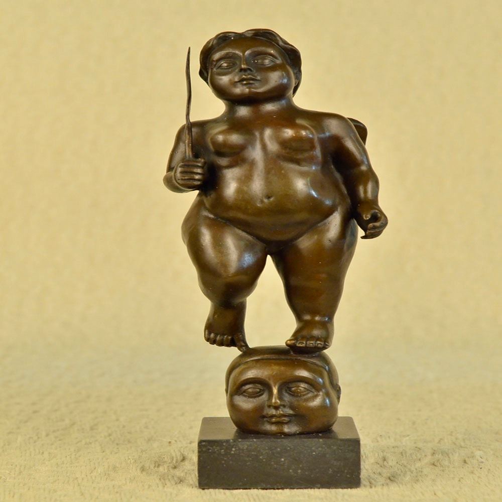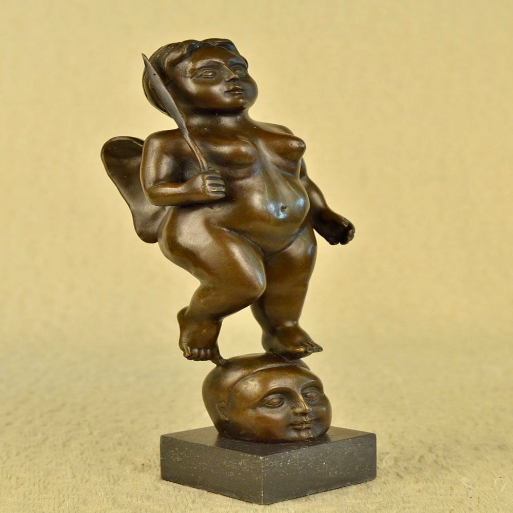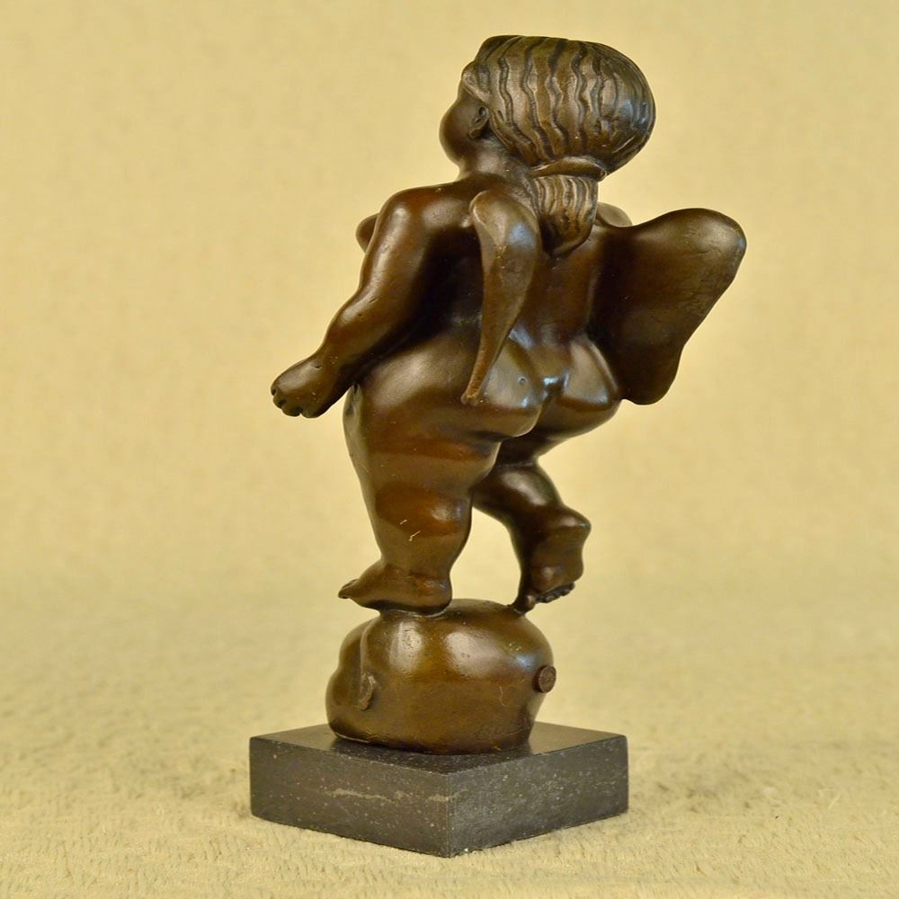 The plump angel stands nude walking upon a decollated head that smiles with chubby cheeks under the weight. She looks out at the beholder, bold with an amiable gentleness, holding a dagger upward in her right hand. The handmade bronze sculpture was cast using the ancient method of lost wax casting and stained with a brown patina finish for preservation and is mounted upon a marble base. Bronze Dimensions with Marble Base: Height 12 X Width 5 inches. Weight: 6 LBS.