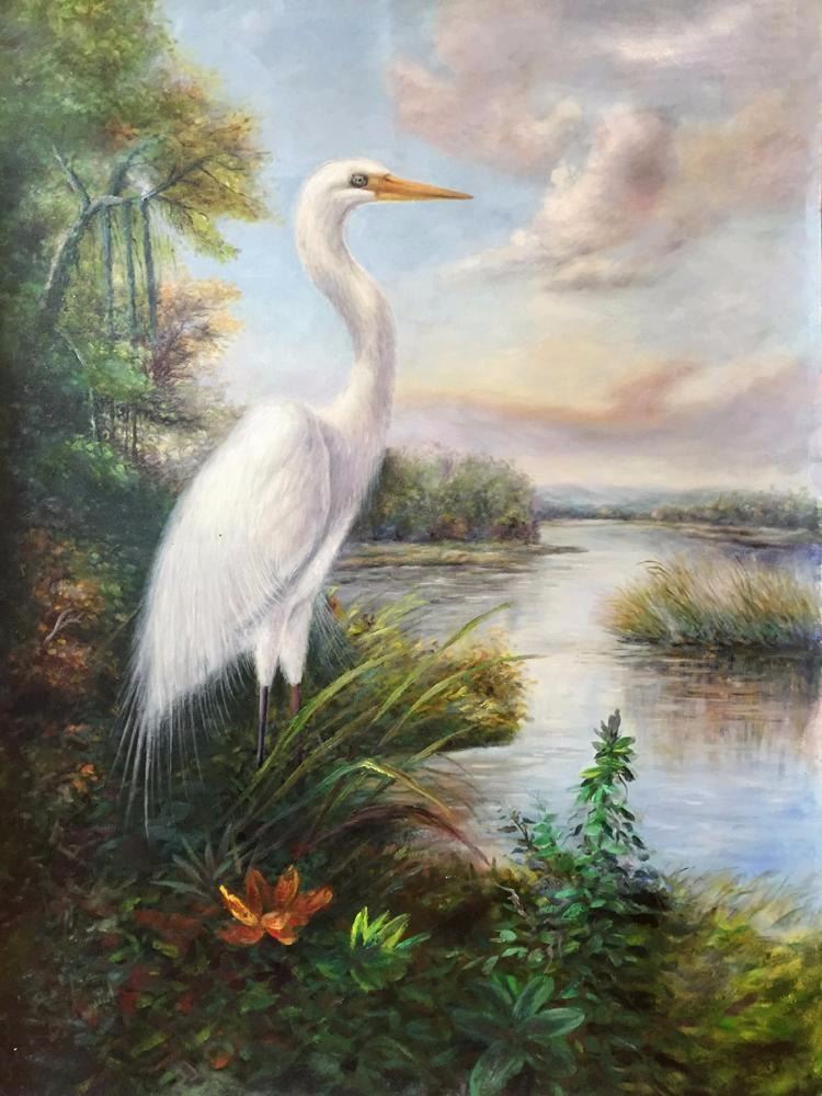 M.P. Elliott | Title of Art: Standing Egret | Medium: Hand Signed Original Acrylic on Canvas | Edition #: Original | Unframed Size: 38 x 26 | Framed Size: Offered Unframed. Framing presentation if shown is for concept only. If you need assistance with custom framing, call the experts at ArtForSale