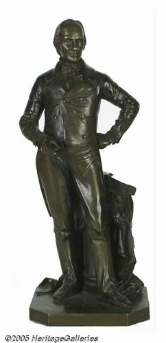 <B>Standing Henry Clay Bronze Figure</B></I> 16" standing bronze figure of the "Great Compromiser," Henry Clay. Signed on the 6 1/2" x 6" base by Boyer (Emile Boyer, French sculptor). Clay stands in front of a draped column, surmounted by a scroll and book (representing, no doubt, the Constitution and the Laws). He stands as he did in the Senate, with one arm akimbo, foot thrust forward and one finger pointing, to highlight his argument. The details of his clothing and features are remarkable and of the highest quality. A fine work of art in excellent condition. Circa 1850-70. Lot:256