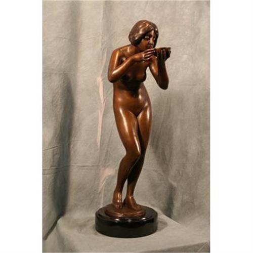 Bronze sculpture of a standing nude drinking from a bowl. Mounted on a absloute black marble base 8"Dia X 26"HT Titled: Trinkende Signed Prof. V.H. Seifert