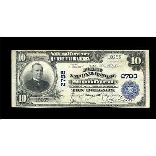 <B>Stanford, KY</B></I> - $10 1902 Plain Back Fr. 624 <B>The First NB</B></I> Ch. # 2788<BR>Despite a decent size issue that spanned several decades, large notes from this Stanford bank are in short supply, with nothing listed in the census before 1902 Plain Backs. Even there, the selection is limited, as only four pieces are listed. This attractive example is as nice as any. <B>Very Fine.</B></I>