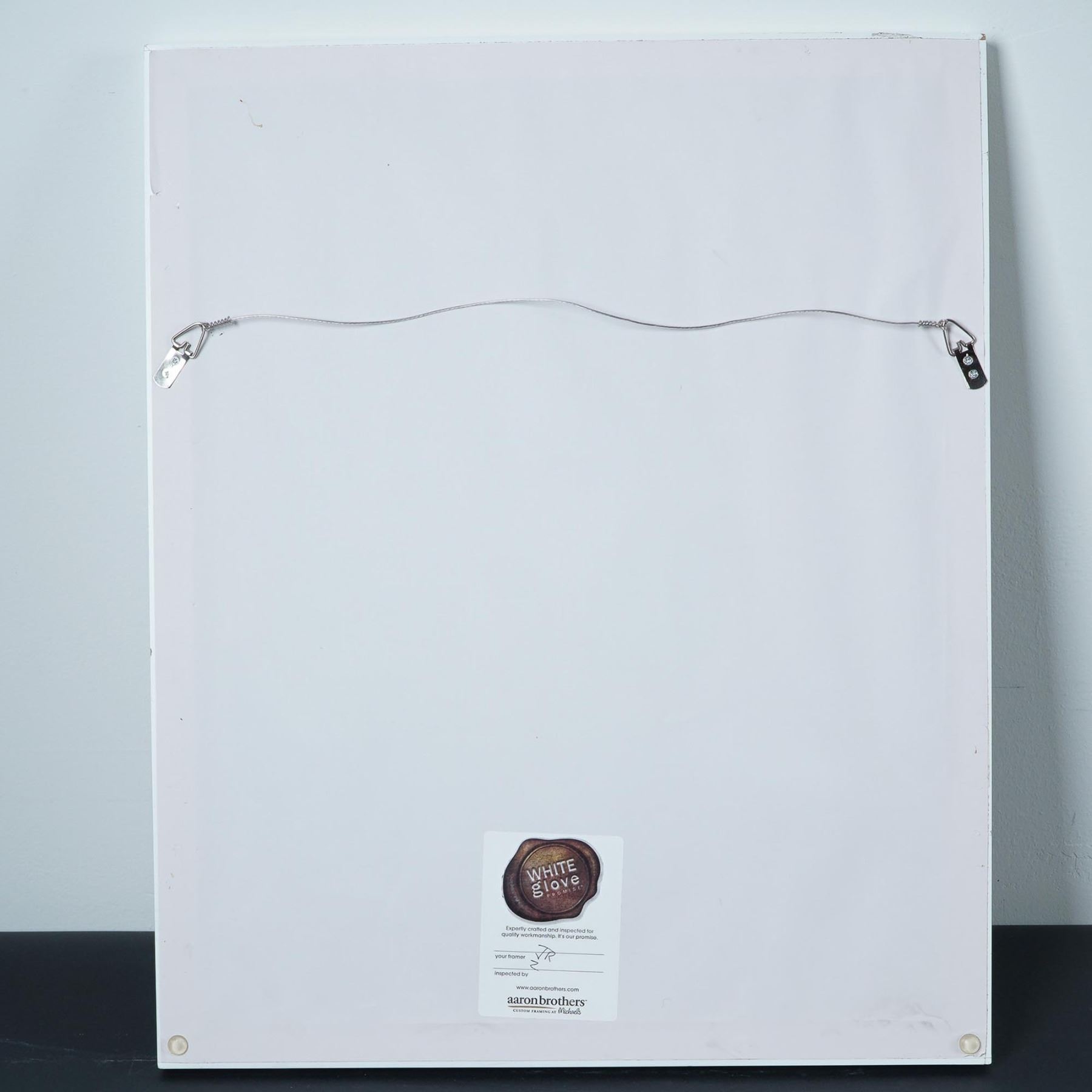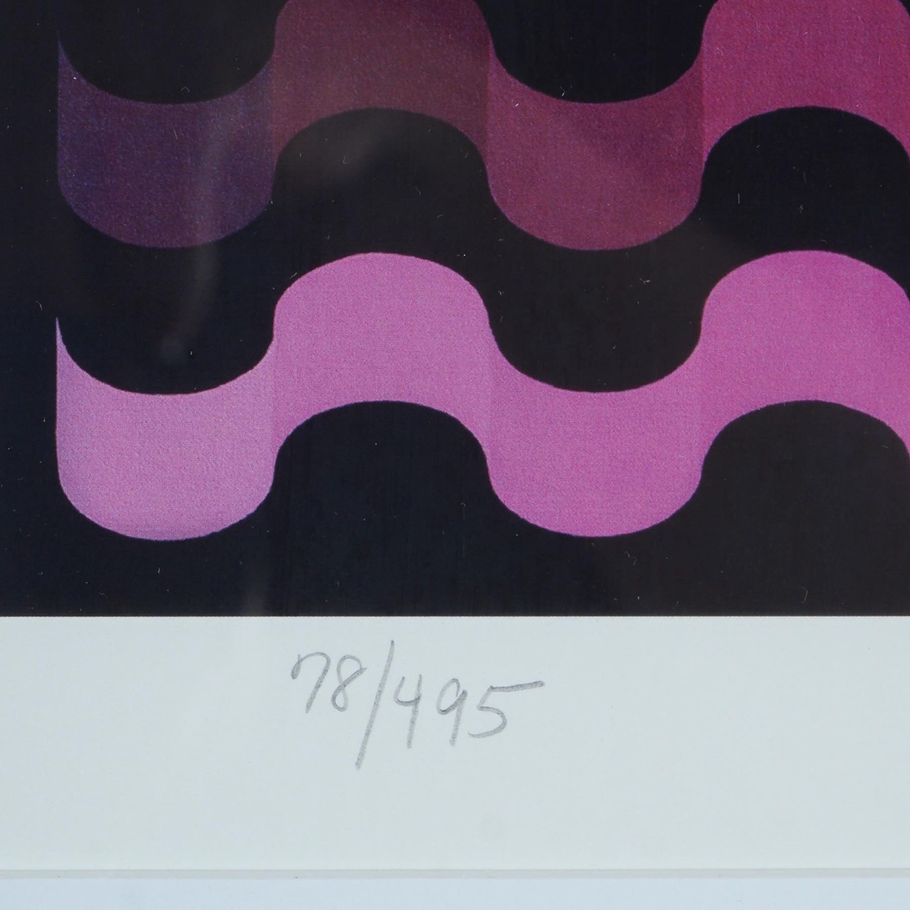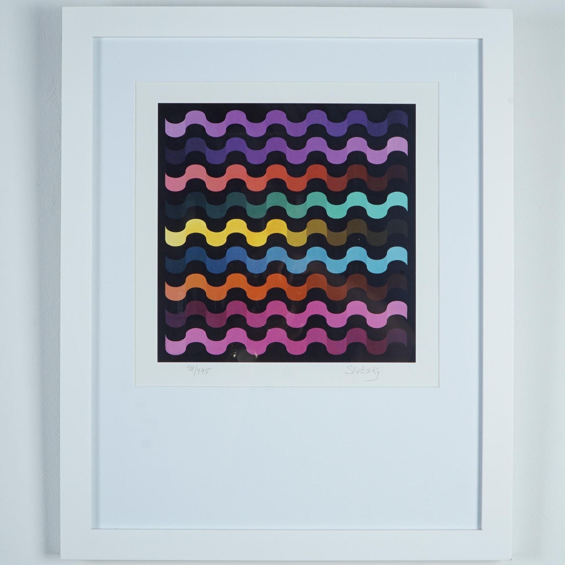 Vibrant abstract serigraph on paper by Optical artist Slutsky, featuring a rhythmic pattern of undulating wave forms in bold hues of pink, orange, red, teal, and blue set against a rich black background. The piece showcases Slutsky's signature exploration of optical movement and color relationships, reminiscent of Op Art aesthetics. A dynamic and collectible work from a noted graphic artist. Signed Slutsky in pencil at the lower right and numbered 78/495 at the lower left. Professionally framed with a clean white mat and contemporary white frame.