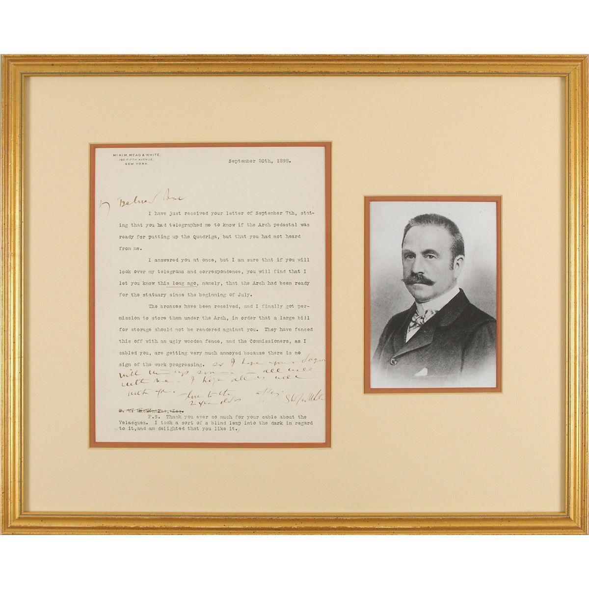 Distinguished American architect (1853–1906) who was a leading figure of the ‘Beaux Arts’ movement. He was fatally shot and killed in the roof garden theatre of the Landmark by the husband of actress Evelyn Nesbit in retribution for a long-ago affair. Scarce TLS, one page, 7.5 x 9.75, McKim, Mead & White letterhead, September 20, 1898. Letter to American sculptor F. W. MacMonnies. In part: “I just received your letter of September 7th, stating that you had telegraphed me to know if the Arch pedestal was ready for putting up the Quadriga, but that you had not heard from me…I let you know this long ago, namely, that the Arch had been ready for the statuary since the beginning of July. The bronzes have been received, and I finally got permission to store them under the Arch, in order that a large bill for storage should not be rendered against you. They have fenced this off with an ugly wooden fence, and the Commissioners, as I cabled you, are getting very much annoyed as there is no sign of the work progressing.” White adds a brief handwritten note at the closing, in part: “All well with me—I hope all is well with you.” Double-matted and framed with a portrait of White to an overall size of 19.5 x 16. In fine condition. This letter concerns the construction of the Soldiers' and Sailors' Arch in Brooklyn, a monument dedicated to ‘The Defenders of the Union, 1861–1865.’ The impressive arch was designed by John H. Duncan and built over the course of three years from 1889 to 1892. When White’s architectural firm was hired to overhaul the plaza in 1893, they recommended that sculptural elements be added to the arch. They commissioned MacMonnies to create three bronze groups, the most spectacular being the ‘Quadriga’ on top, portraying the winged goddess of victory between two trumpeting winged attendants. A highly uncommon example with superior architectural and artistic content.