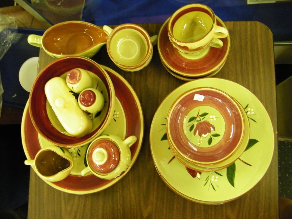 Includes 1 large chop plate, 4 dinner plates, 4 bread/butter plates, 4 cup/saucer sets, 1 sugar bowl w/ lid, 1 creamer, gravy boat, serving bowl, salt/pepper shakers and butter lid.