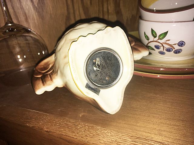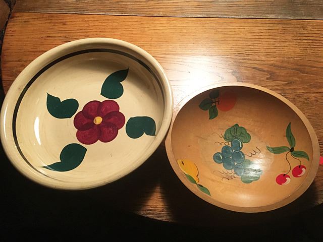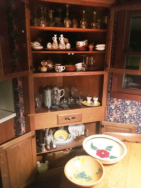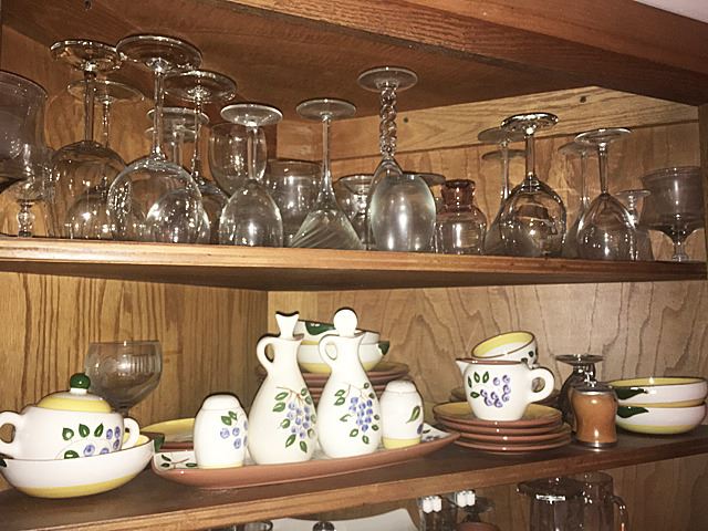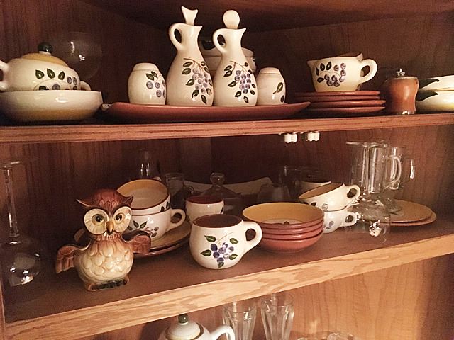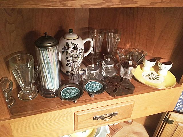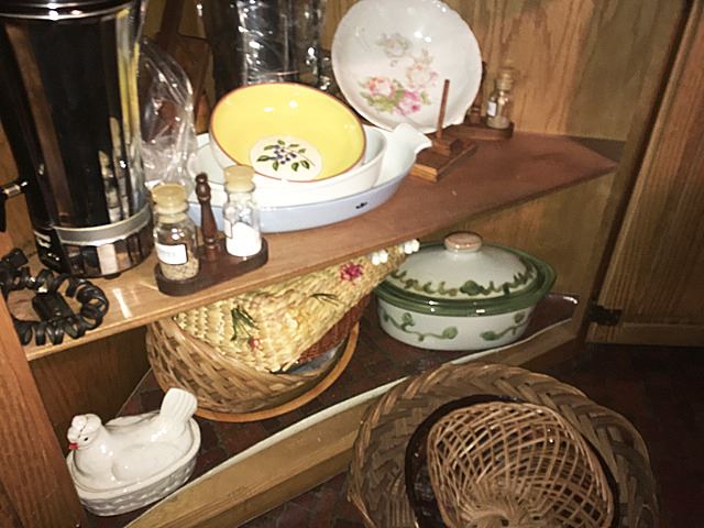 Stangl dinner set including cruet set, egg cups, tea set, dinner and luncheon plates, cups and saucers, bowls, crystal glassware, Goebel owl figurine, nice vintage straw holder and ice cream/dessert cups, enameled Arts and Crafts trivets, silvelr inlaid cruet, baskets, perculator coffee pot, hen in basket, bowls, etc., all from the farmhouse kitchen!
