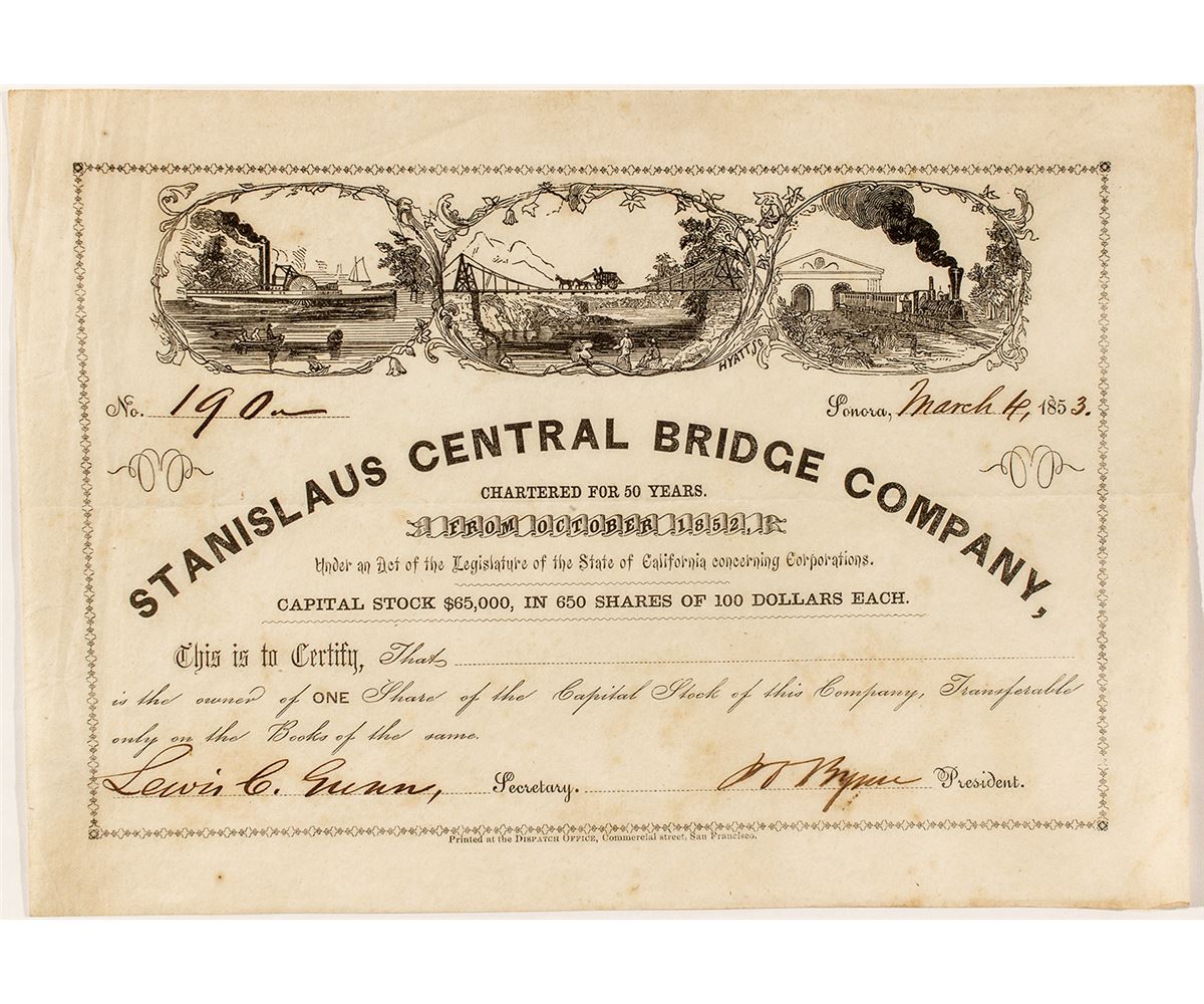 Inc. in Oct. 1852. No. 190. One share. Dated March 4, 1853 and signed by Byrne (president) and Gunn (secretary), but not issued. Three vignettes: paddle steamer (top left), stagecoach crossing bridge (top center), and locomotive (top right). Printed at the Dispatch Office, San Francisco. 6.5" x 9" with some toning. The company's plan was to build an iron suspension bridge above the Stanislaus River. The company directors had not yet approved the completion of the bridge and insisted that additional cables were needed, when, on November 19, 1853, the bridge collapsed as a wagon and team of horses were crossing it. Augustin Hale and his partners paid the company's debts with their own money. (Prag Collection)