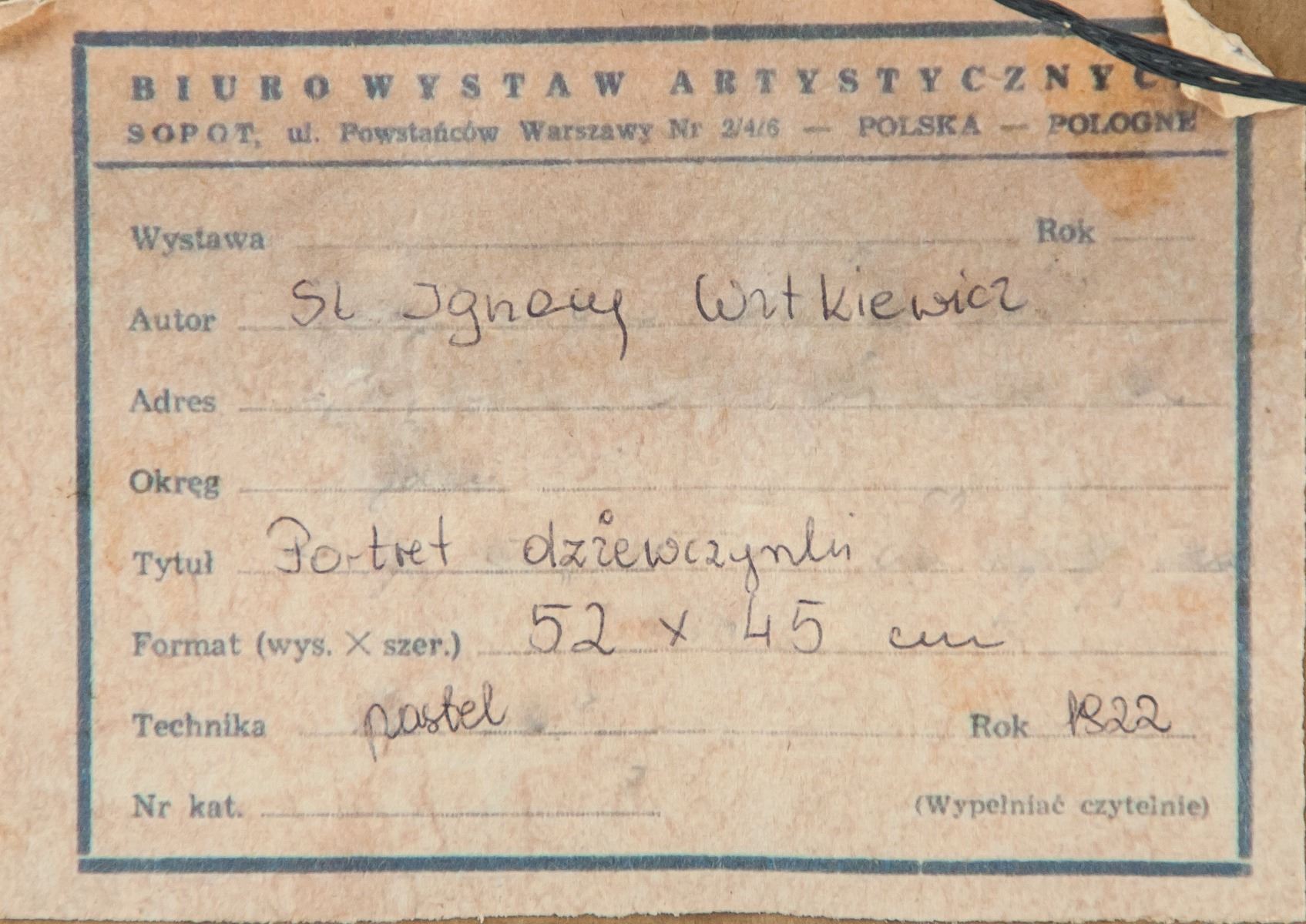 Pastel on paper, framed. Featuring a portrait of a girl. Signed Witkacy and inscribed 1922 underneath on the lower right corner. Stamped ZAMEK KROLEWSKI / w Warszawe / ks. wpL.FC/729/EA on verso. Label affixed to verso inscribed BIURO WYSTAW ARTYSTYCZNYC / SPOPT, ul. POWSTANCOW WARSZAWY Nr 3/4/6 - POLSKA - POLOGNE. Underneath inscribed Wystawa / Autor St. Ignacy Witkeisicz / with title and dimensions and medium. Attributed to Stanislaw Ignacy Witkiewicz (1885-1939, Polish). 52 x 45 cm (20.5 x 17.7 inches). Framed size: 59.5 x 44.5 cm (23.4 x 17.5 inches)