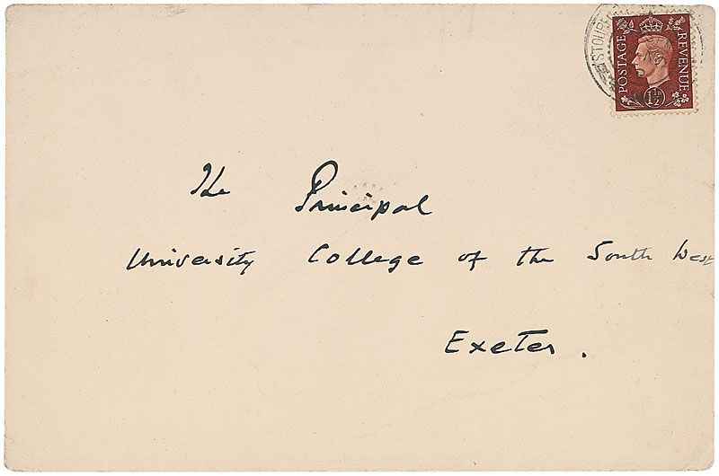 British politician who served as prime minister three times (1867–1947). ALS signed “Baldwin of Bewdley,” one page, 6.25 x 8, Astley Hall letterhead, November 23, 1939. Jovial letter to a University College of the South West official. In full: “Certainly if I live and remain in possession of my faculties, I have every intention of coming to Exeter in the early summer and you can tell any one I said so!” In fine condition. Accompanied by the original mailing envelope, filled out in Baldwin’s hand.