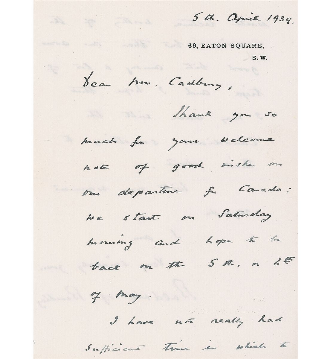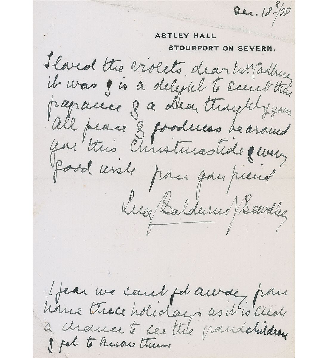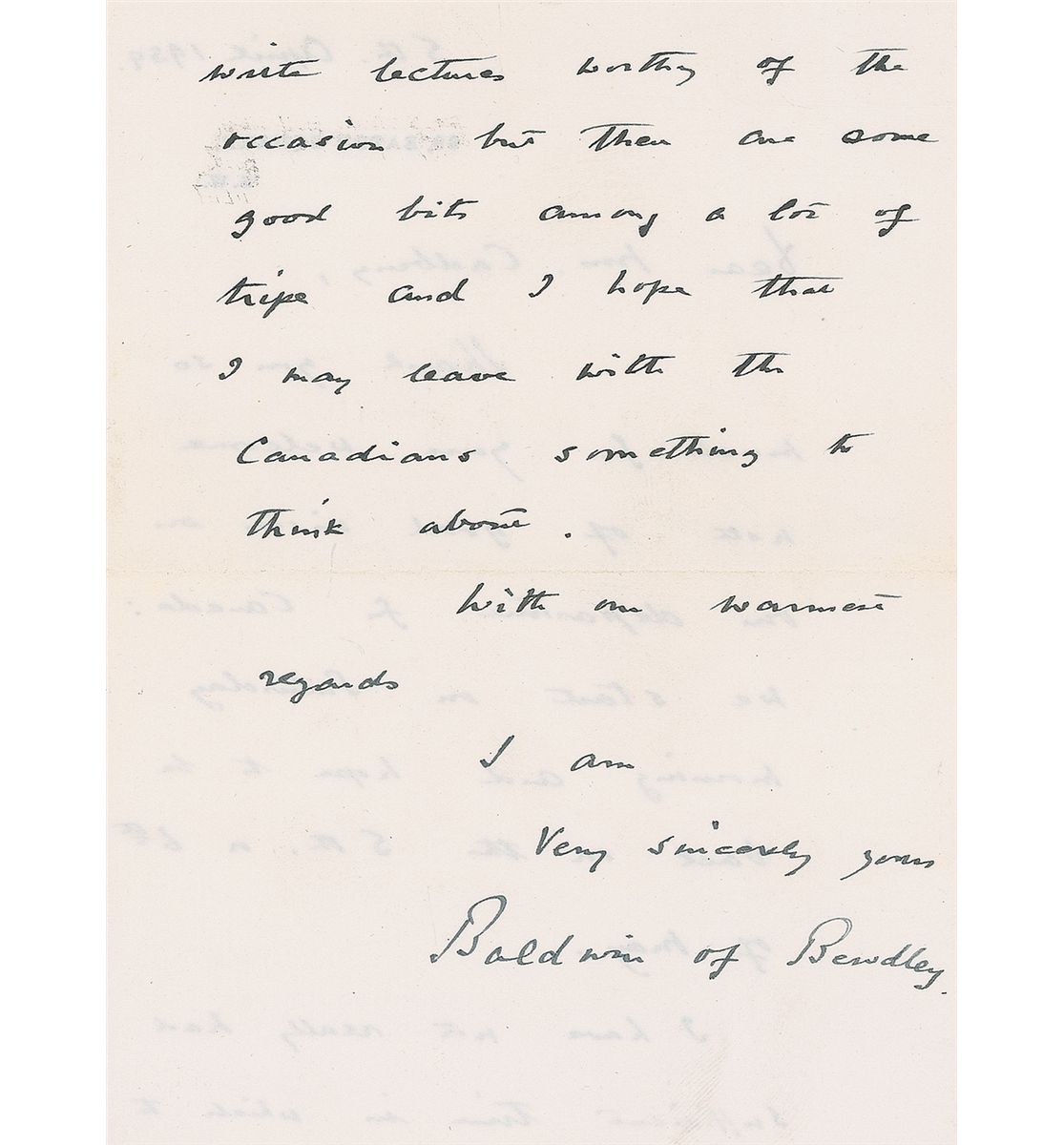 ALS signed “Baldwin of Bewdley,” one page both sides, 5 x 6.75, personal letterhead, April 5, 1939. Letter regarding a trip to Canada. In part: “I have not really had sufficient time in which to write lectures worthy of the occasion but there are some good bits among a lot of tripe and I hope that I may leave with the Canadians something to think about.” In fine condition. Accompanied by an ALS from his wife, Lucy.