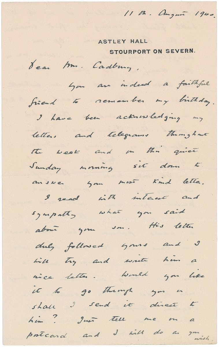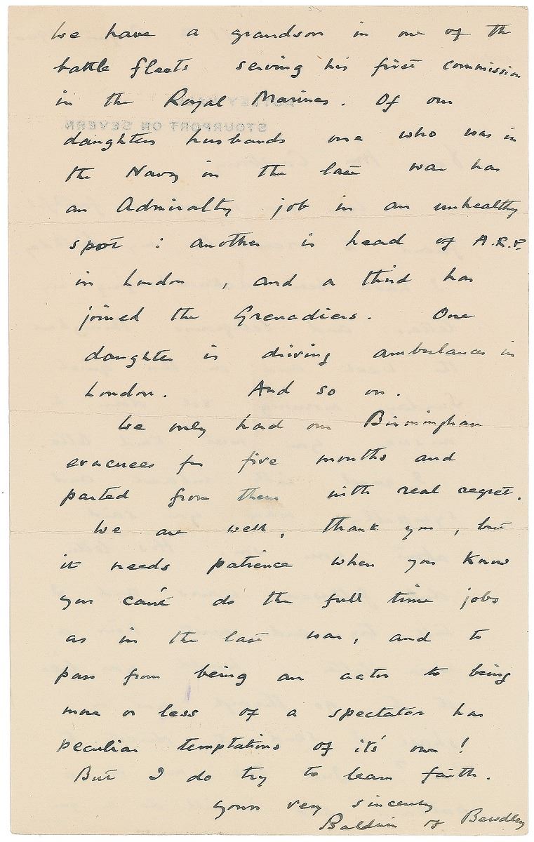 British politician who served as prime minister three times (1867–1947). World War II–dated ALS signed “Baldwin of Bewdley,” one page both sides, 5 x 8, Astley Hall letterhead, August 11, 1940. Letter to Mr. Cadbury. In part: “You are indeed a faithful friend to remember my birthday…We have a grandson in one of the battle fleets serving his first commission in the Royal Marines. Of our daughters’ husbands one who is in the Navy in the last has an Admiralty job in an unhealthy spot: another in head of A.R.P. in London, and a third has joined the Grenadiers. One daughter is driving ambulances in London. And so on….It needs patience when you know you can’t do the full time jobs as in the last war, and to pass from being an actor to being more or less of a spectator has peculiar temptations of its own!” In fine condition.
