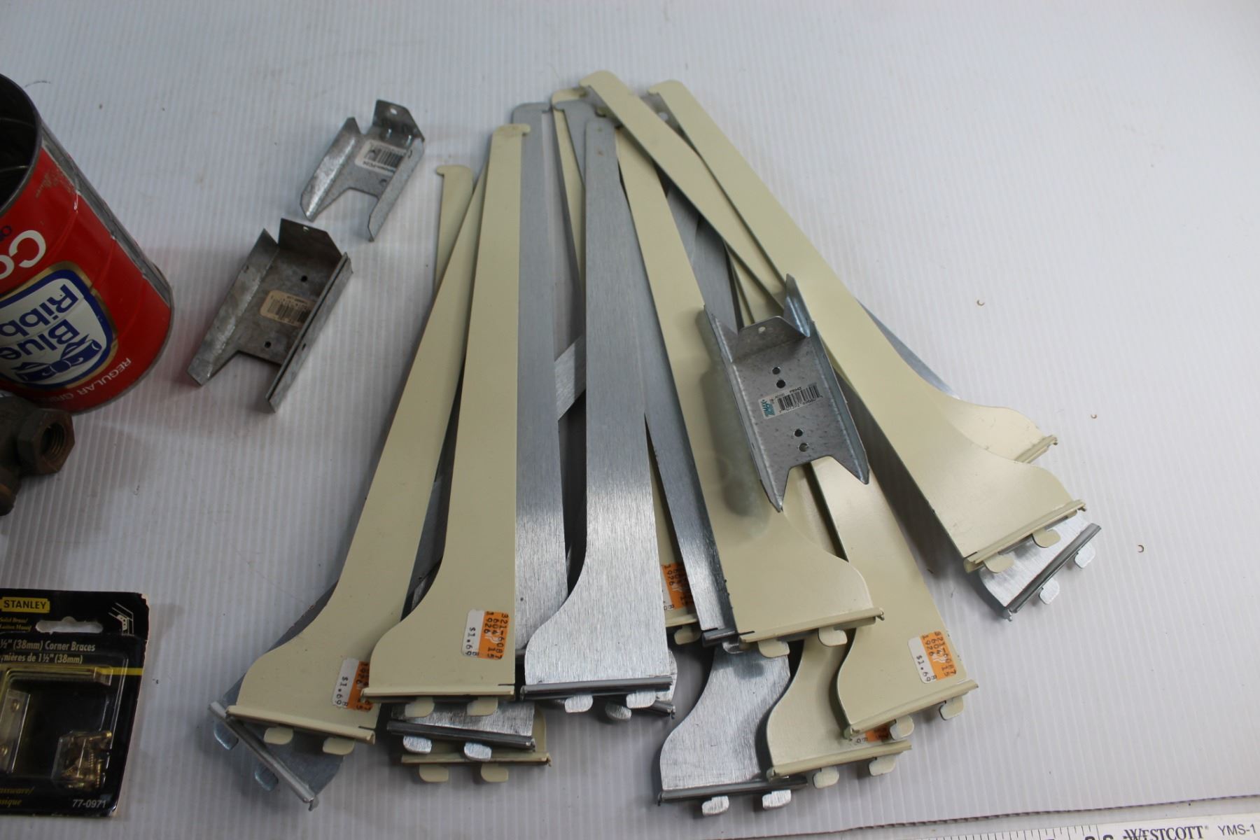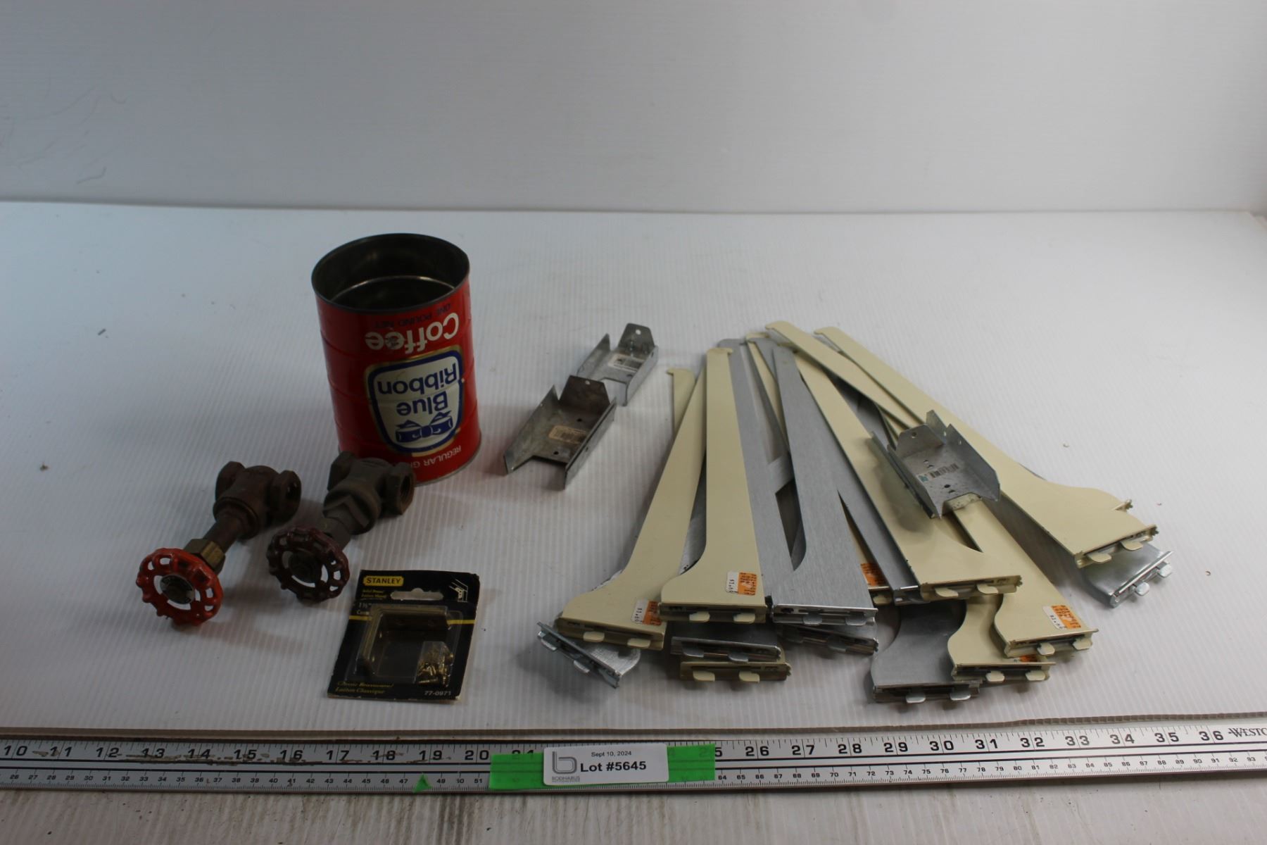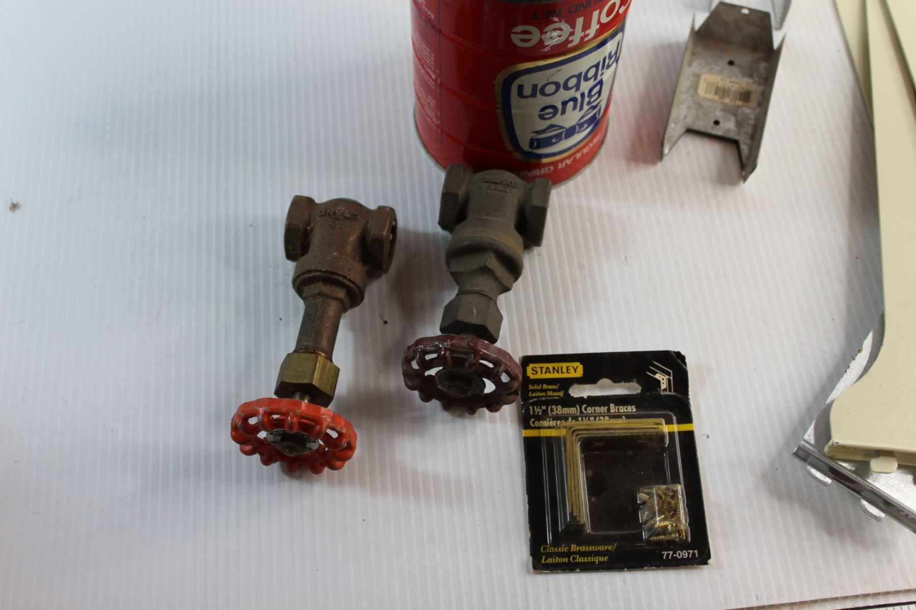 Stanley Corner Braces, (2) Brass Gate Valves, (10+) Shelf Brackets and Assorted Hardware