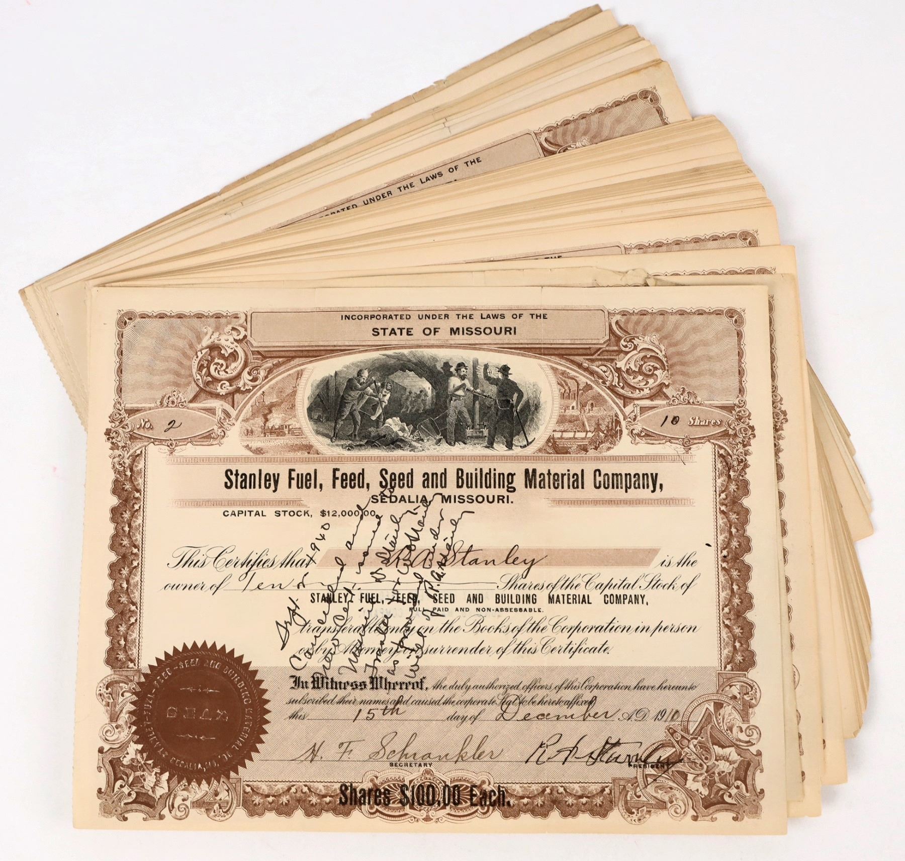 25+. U/U, I/C. Issued 1907-28. Stanley Fuel, Feed Seed And Building Material Co, #2 is in the lot. Unk. printer.