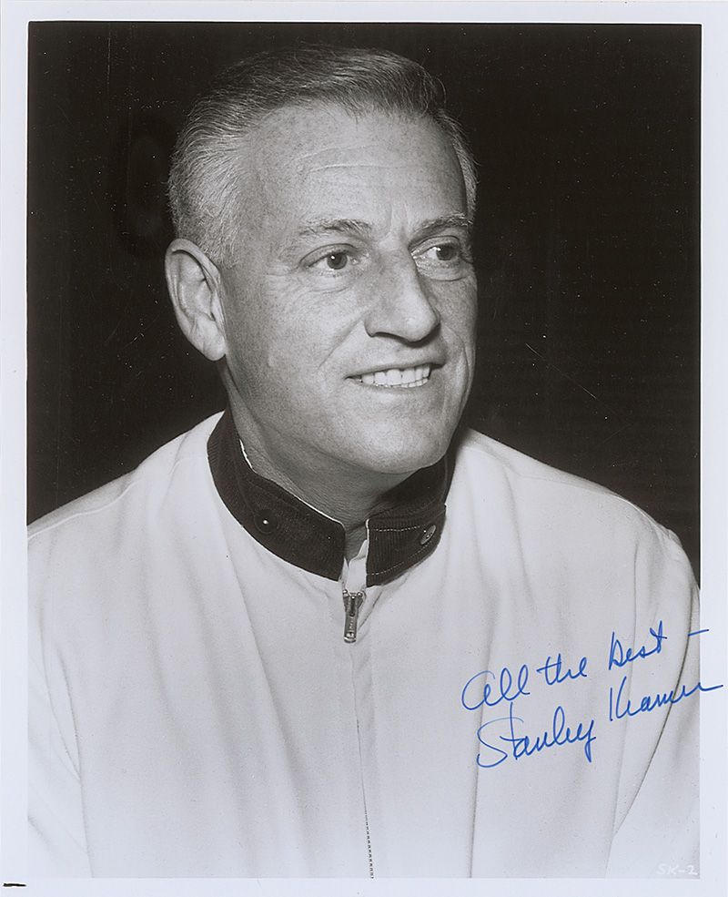 Glossy 8 x 10 photo of the visionary director, signed in blue felt tip, “All the best—Stanley Kramer.” In fine condition.