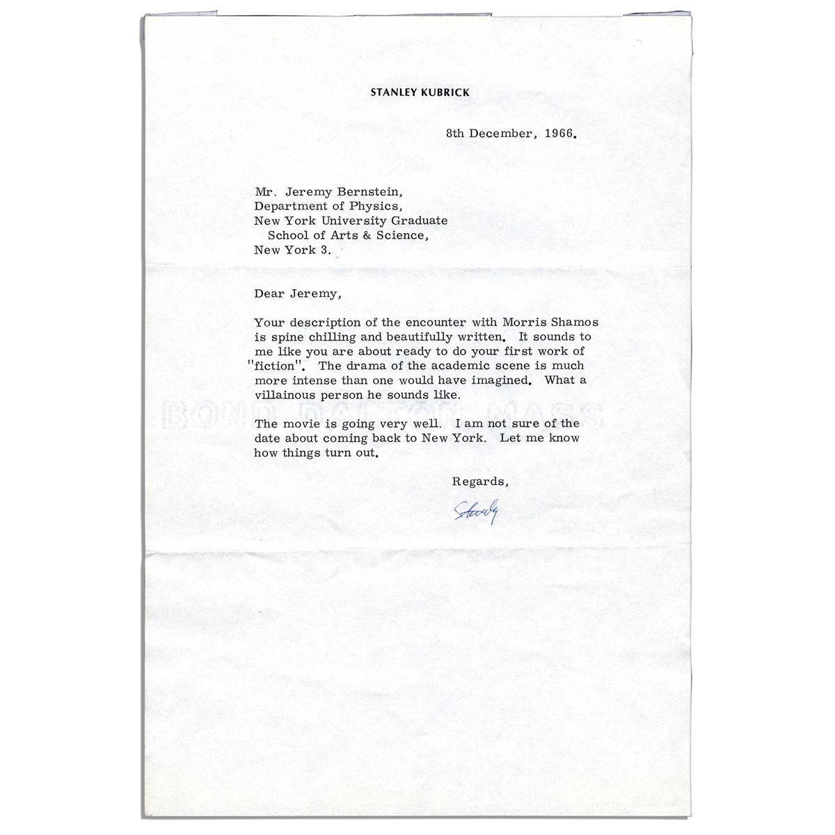 Stanley Kubrick typed letter signed on his personal stationery, dated 8 December 1966 as he was filming ''2001: A Space Odyssey.'' Letter is addressed to ''New Yorker'' journalist Jeremy Bernstein, who profiled the director for the magazine and the two remained friends. Reads in full: ''Your description of the encounter with Morris Shamos is spine chilling and beautifully written. It sounds to me like you are about ready to do your first work of 'fiction.' The drama of the academic scene is much more intense than one would have imagined. What a villainous person he sounds like. The movie is going well. I am not sure of the date about coming back to New York. Let me know how things turn out.'' Signed ''Stanley'' in blue ink. Letter measures 7.25'' x 10.5''. Very minor toning, else near fine.