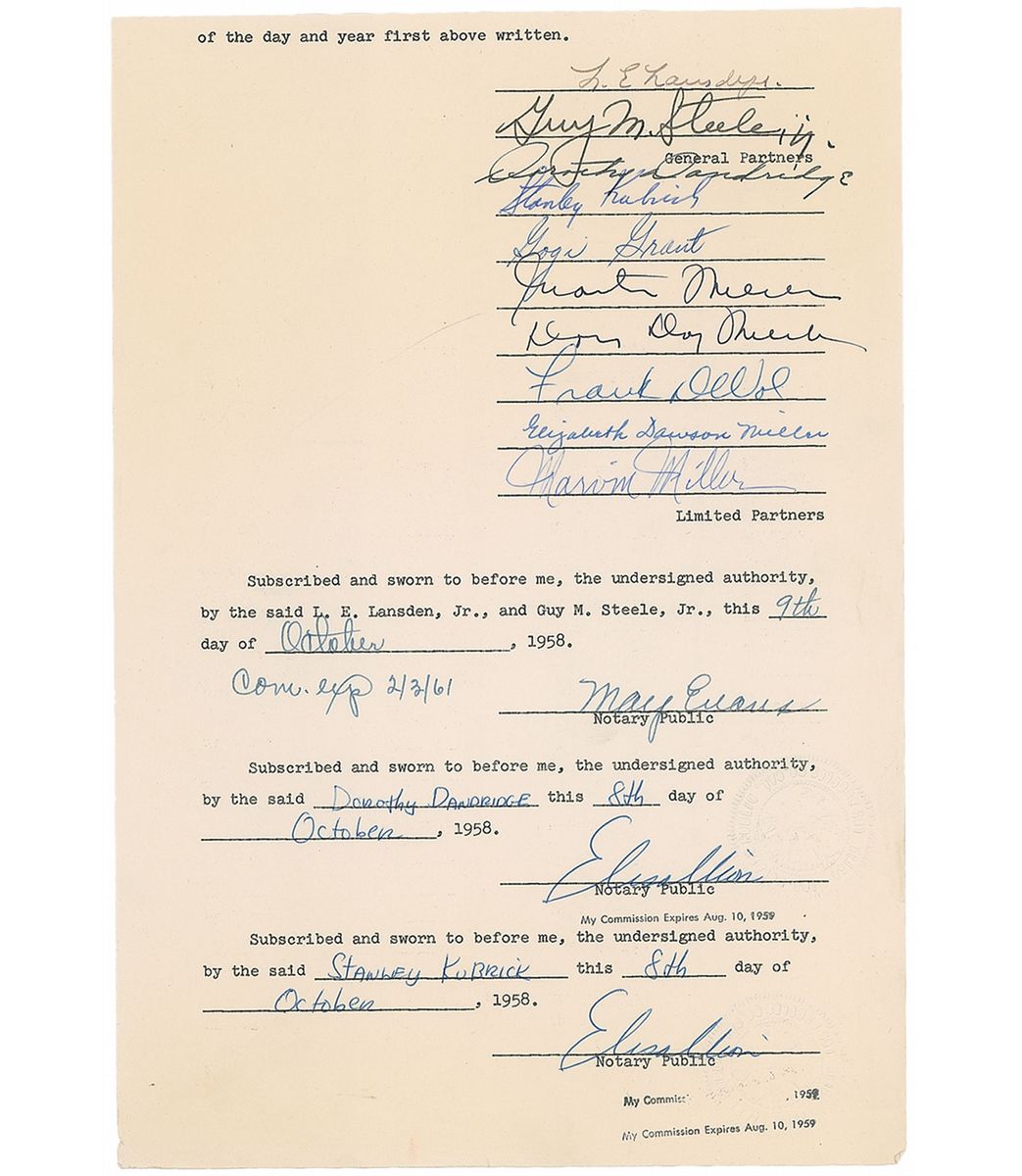 Partial notarized DS, four pages, 8.5 x 12.5, October 9, 1958. Partial document outlining the contributions of Kubrick, Dandridge, and three others in an investment involving “oil, gas and other minerals,” in partnership with Doris Day, Gogi Grant, Marvin Miller, and Frank De Vol. Signed on the last page by Kubrick, Dandridge, Grant, Day, and six others. In fine condition, with expected light document wear. An interesting document with numerous cinematic associations: Dandridge and Day were celebrated actresses; De Vol was an Oscar-nominated film composer; and Kubrick an award-winning director.