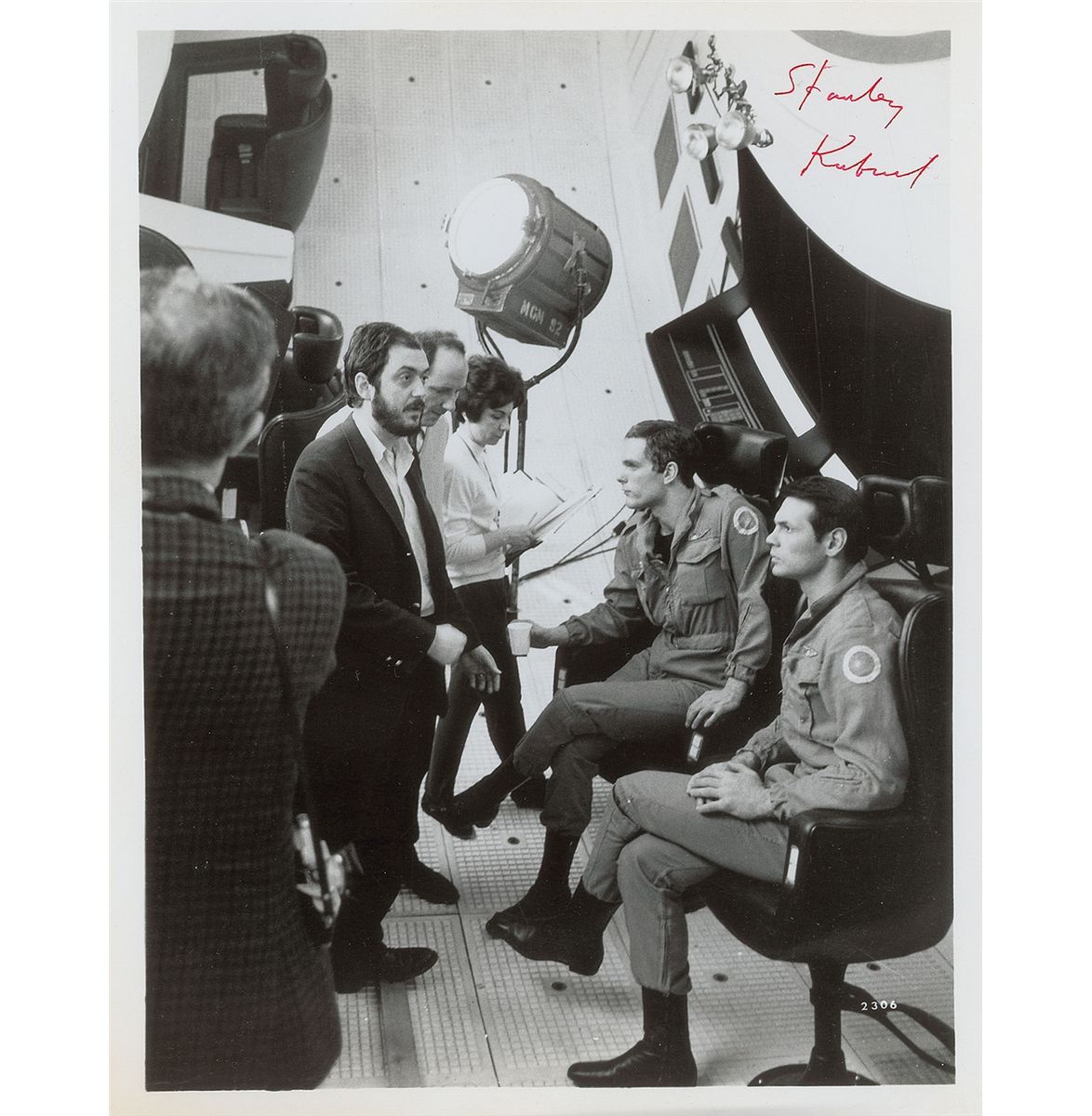 Uncommon glossy 8 x 10 photo of Kubrick on set during the making of the classic 2001: A Space Odyssey, signed in red ink. In fine condition, with scattered surface spotting.