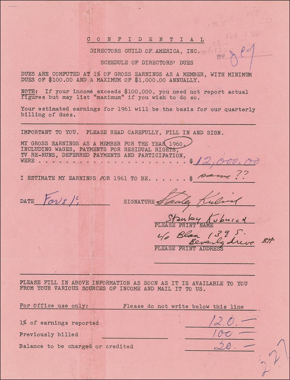 DS, one page, 8.5 x 11, stamp-dated February 7, 1961. Schedule of director’s dues for the Director’s Guild of America. Form provides space for reporting gross earnings for 1960 as a member of the Guild. Form indicates Kubrick’s earnings at $12,000 for 1960 and predicts “same” for 1961. Signed in black ink by Kubrick, who also prints his name and address underneath his signature. Intersecting folds, vertical strip of adhesive residue to left side, and several office notations, otherwise fine condition. Pre-certified PSA/DNA and RRAuction COA.