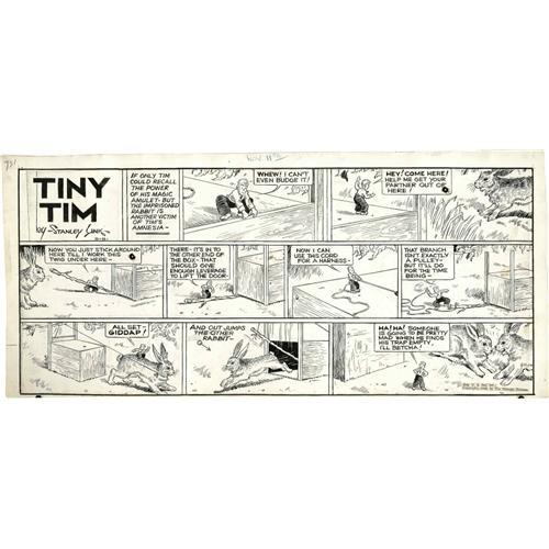 <B>Stanley Link - Tiny Tim Sunday Comic Strip Original Art, dated 11-11-45 (The Chicago Tribune, 1945).</B></I> With a little bit of ingenuity, two inch tall Tiny Tim frees a captured rabbit, in this Stanley Link Sunday. This strip has an image area measuring 19" x 8.25" and, aside from some slight staining in several panels, the art is in Very Good condition.