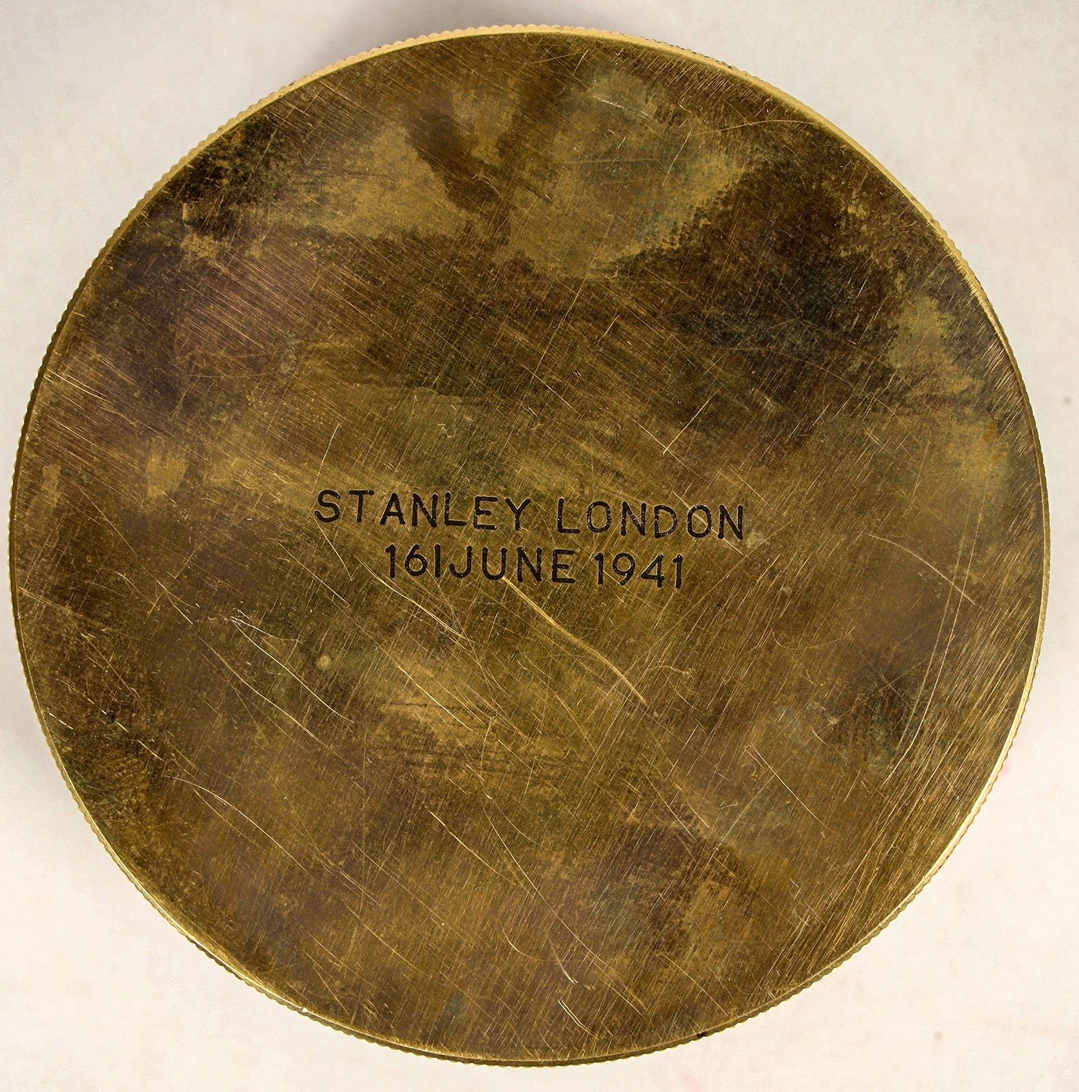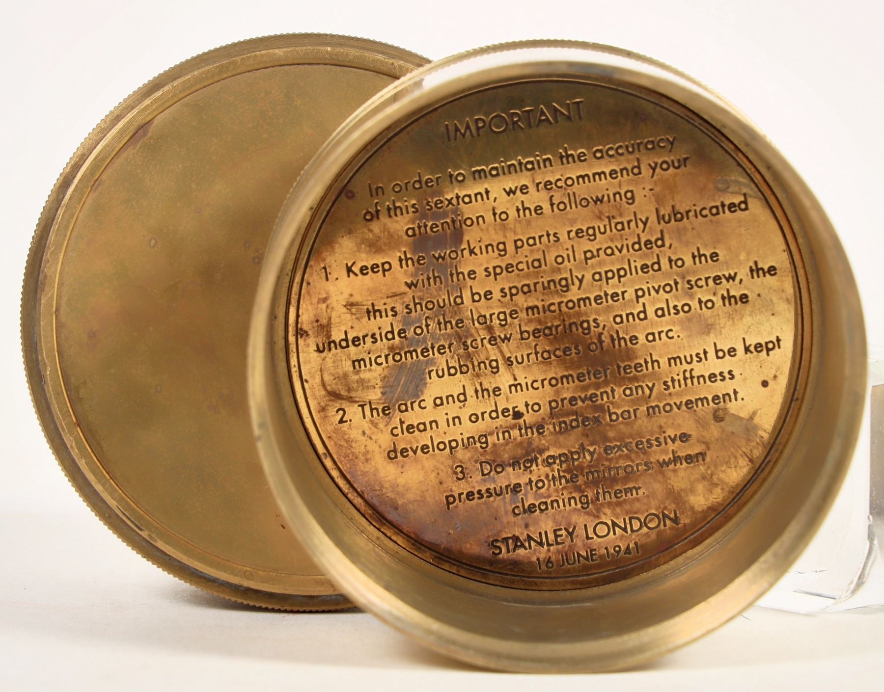 This Stanley sextant is marked "16/June 1941" London", on the lid. This date is significant in British history as WInston Churchill asks (by radio) for support from the United States as Great Britain struggles against German aggression. The instruction for cleaning and lubing are written on the inside cover. From the Popovich collection. Please see photo for details.